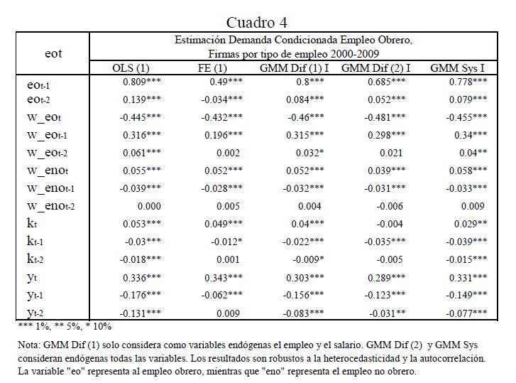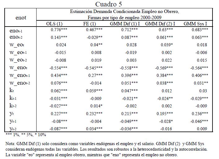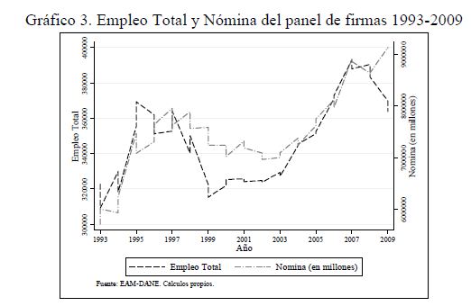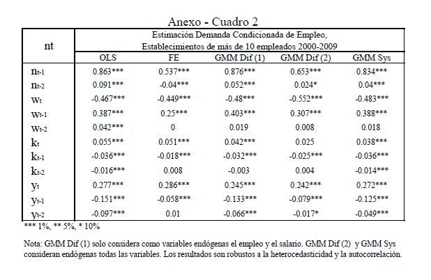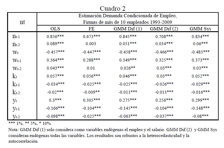 Este trabajo utiliza un panel de firmas de la industria Colombiana para analizar las principales variables que inciden en la dinámica de la demanda laboral en los periodos 1993-2009 y 2000-2009. Se estiman funciones de demanda dinámicas a través de metodologías estándar y mediante modelos Panel VAR, y se encuentra: (i) una fuerte persistencia en el empleo, particularmente del no obrero, (ii) una alta sensibilidad por parte de la demanda de empleo ante un choque sobre la producción de la firma, en especial para el empleo no obrero, (iii) la respuesta del empleo obrero a su salario es significativamente 05r a la encontrada para el empleo no obrero, y (iv) el salario directo genera choques negativos sobre el empleo, aunque con 05r fuerza en el empleo obrero.