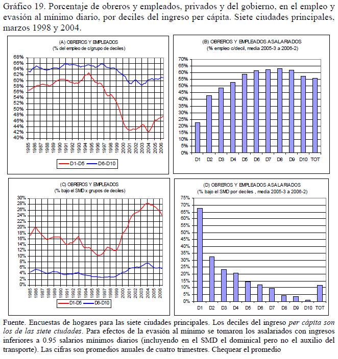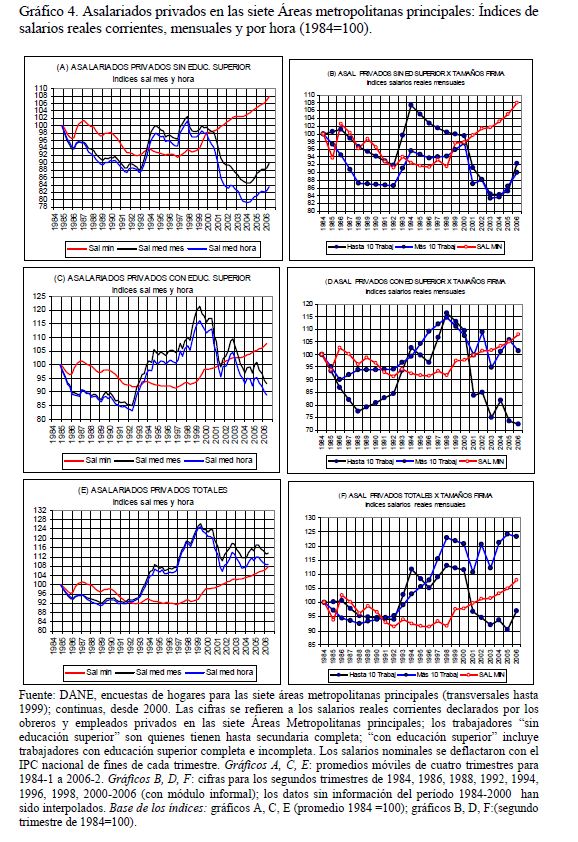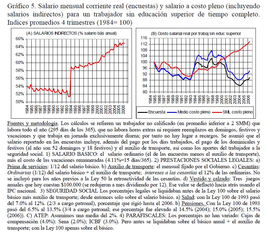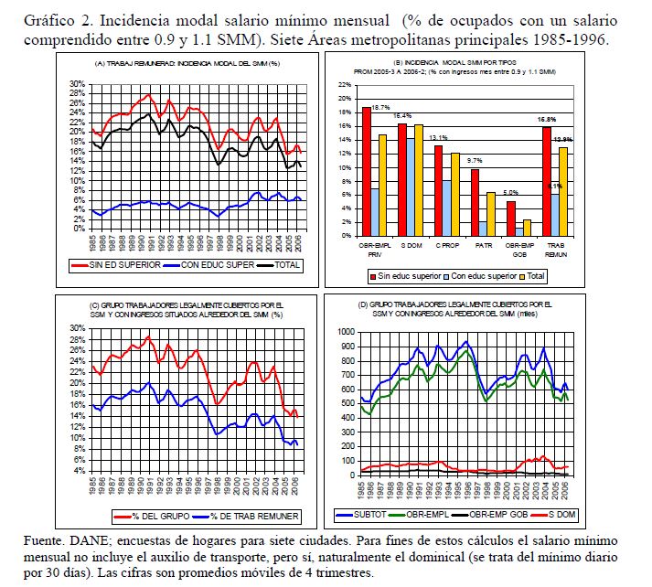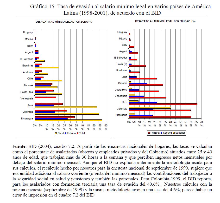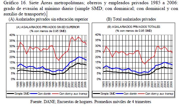 Este artículo pretende examinar -con base en las series trimestrales, 1984-2006, de las encuestas de hogares del DANE para las siete principales áreas metropolitanas de Colombia- el grado de evasión al salario mínimo legal (SML) en Colombia; se ocupa también de las estrategias que han puesto en práctica las empresas privadas (05r uso de horas extras, recomposición del empleo en contra de los trabajadores jóvenes sin educación superior, incremento en la evasión) para evitar que las alzas que se produjeron desde 1993/94 en los salarios indirectos y, desde 1999, en el mínimo real, se trasladaran al salario medio; se ocupa también de la relación entre el salario mínimo y la pobreza. Sugiere que, en vez de elevar adicionalmente el mínimo real es preferible incidir en su acatamiento legal mediante una 05r inspección y vigilancia, sobre todo para el dominical y el auxilio de transporte.