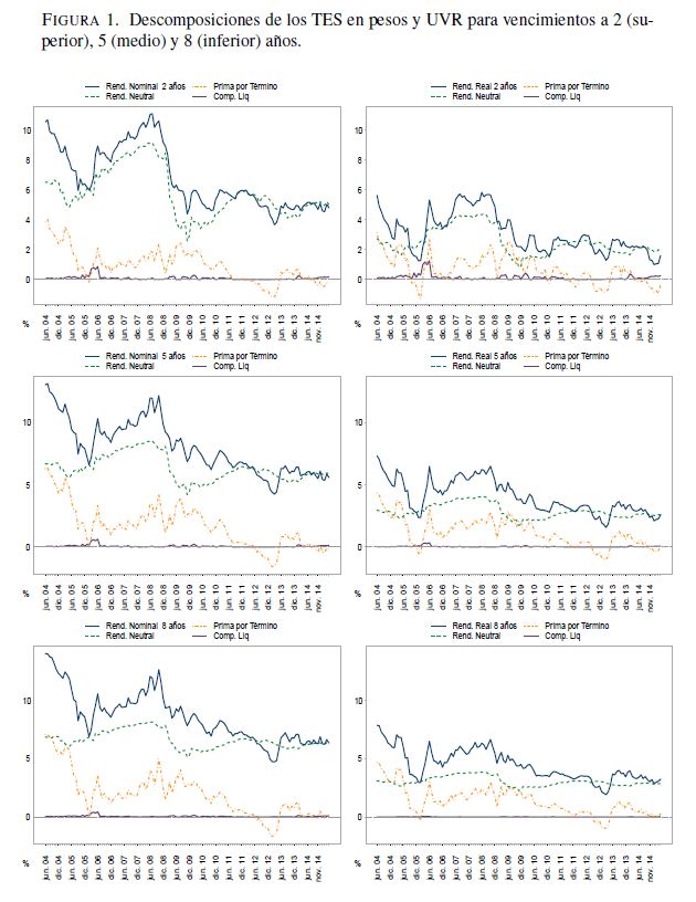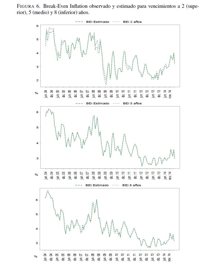 Se estima la descomposición del break-even inflation a partir de un modelo afín de 6 factores de la estructura a términos, nominal y real, de los bonos soberanos de Colombia, dentro de los cuales se incluye un factor asociado a la liquidez. Esta medida se descompone en expectativas de inflación, prima de riesgo inflacionario y prima de liquidez para el periodo comprendido entre 06 de 2004 y 04 de 2015. Los resultados obtenidos indican que el break-even inflation es una medida apropiada de las expectativas de inflación en el corto plazo (2 años). Adicionalmente, se encuentra que la prima de riesgo inflacionario disminuye en el tiempo, lo que se puede deber al aumento de la confianza en la política monetaria por parte de los agentes. Por último, la prima de liquidez toma valores muy pequeños para la 05ría de los períodos de tiempo y sólo tiene efectos considerables durante ciertos episodios a lo largo de la curva de rendimientos, como el ocurrido durante el primer semestre de 2006.