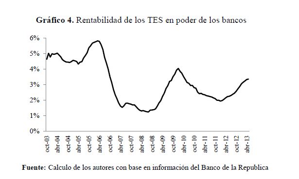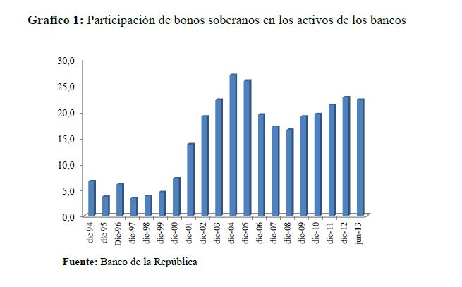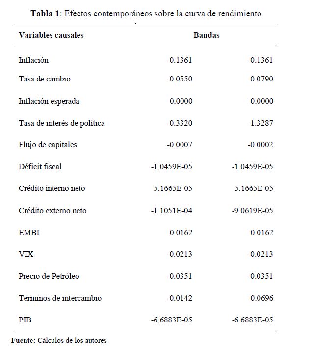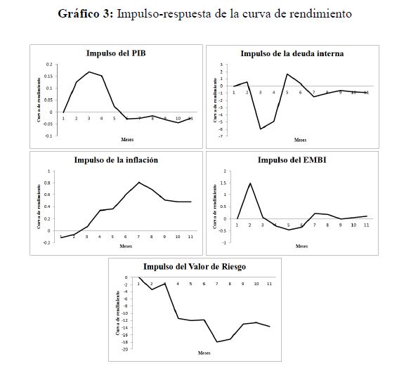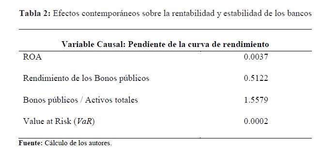 Durante las dos últimas décadas, los mercados de deuda pública se han desarrollado significativamente en las economías emergentes. A pesar de las ventajas que el desarrollo de este mercado tiene sobre el sector financiero, la volatilidad en el precio de los bonos soberanos conlleva riesgos potenciales para la rentabilidad y la estabilidad financiera. Este trabajo utiliza Gráficos Acíclicos Direccionados y modelos SVAR para evaluar el impacto de diversos choques sobre la pendiente de la curva de rendimiento, y sobre la rentabilidad y estabilidad del sistema bancario. Los resultados sugieren que la inflación, la tasa de interés de política monetaria y los indicadores de percepción del riesgo son las variables con 05r impacto sobre la pendiente de la curva de rendimiento. De otro lado, cuando la pendiente de la curva aumenta, la respuesta sobre la rentabilidad y la proporción de bonos en el portafolio de los bancos es positiva. Así mismo, un aumento de la pendiente de la curva tiene un efecto contemporáneo positivo sobre la estabilidad financiera, medida a través del indicador de riesgo, VaR, el cual disminuye en el tiempo hasta a estabilizarse alrededor de cero.