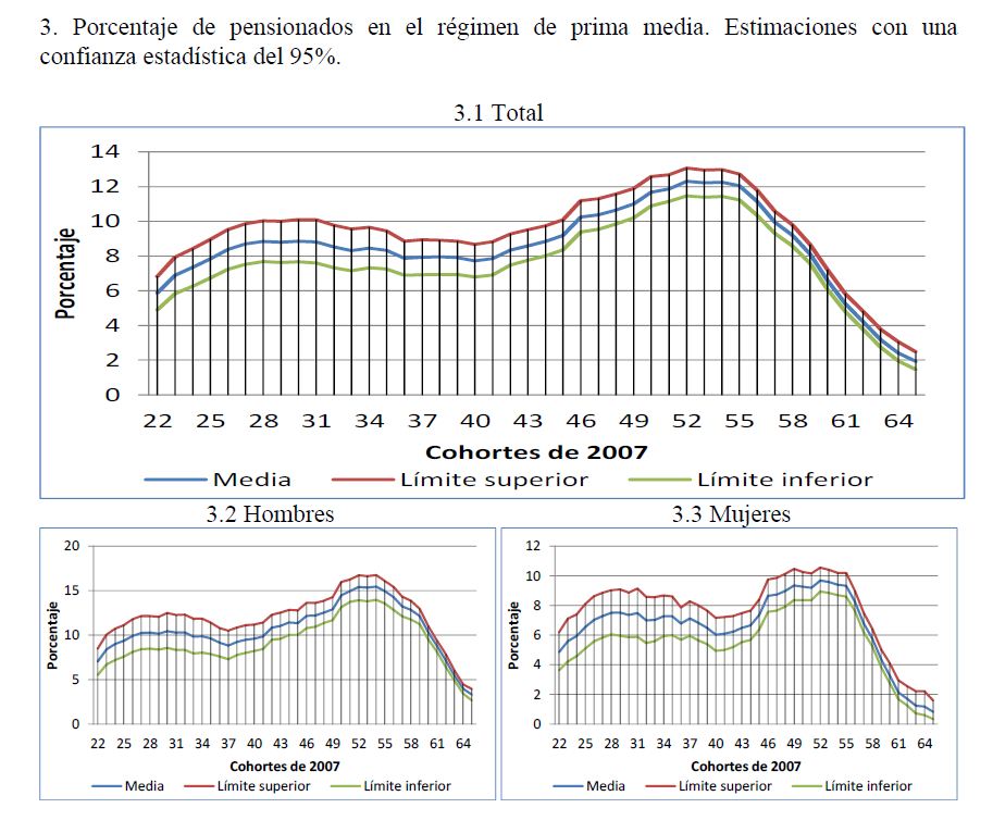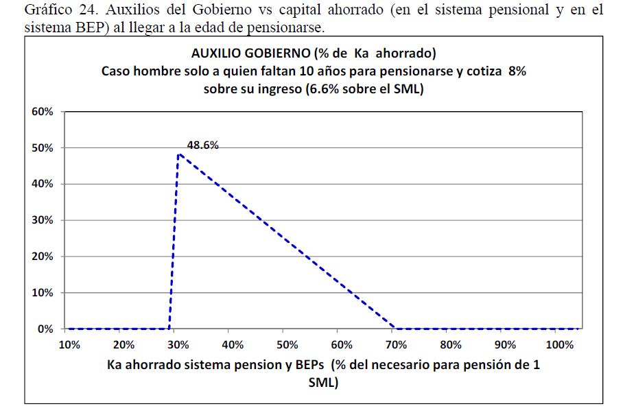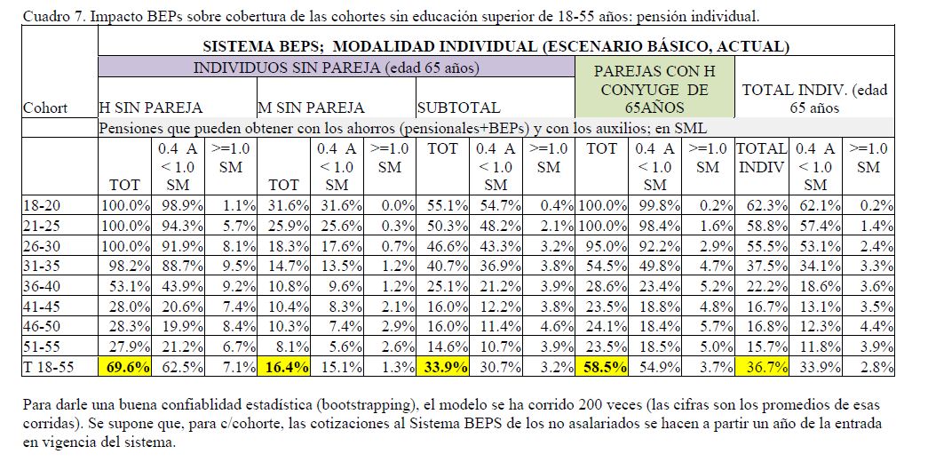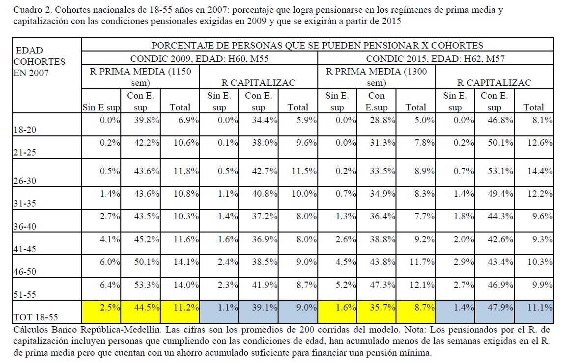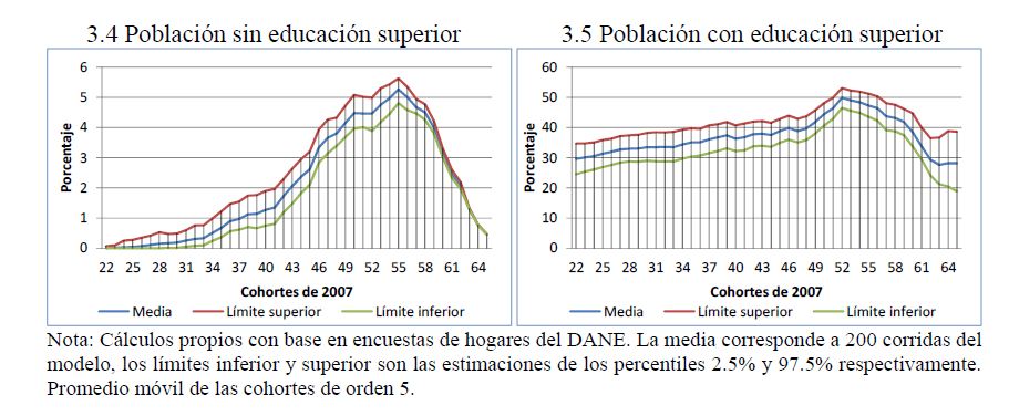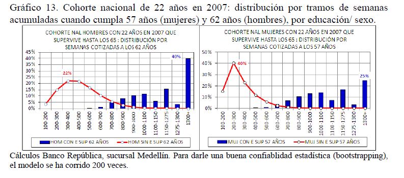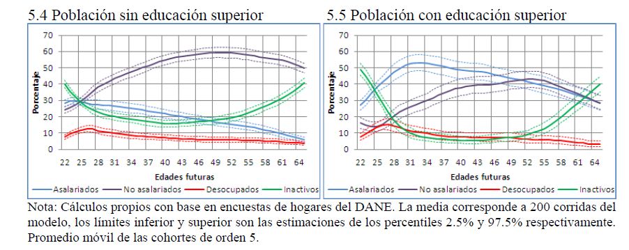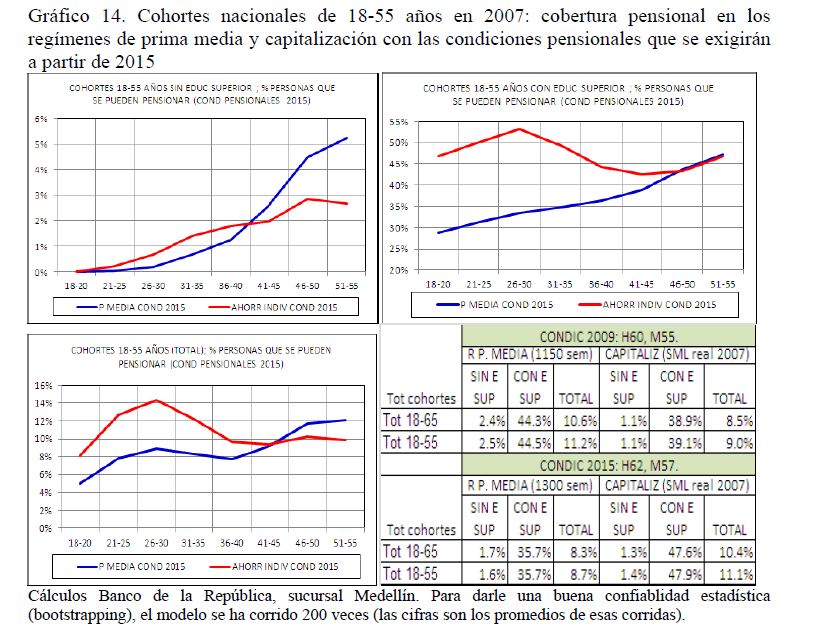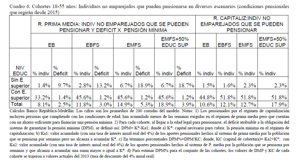 Este artículo examina el problema que plantea la cobertura pensional de los colombianos menos educados y más vulnerables. Relaciona las tendencias del mercado laboral con la baja cobertura pensional: el sesgo del empleo urbano moderno contra los menos educados ha generado para estos un ciclo de vida laboral muy marcado (empleo asalariado para los jóvenes, informal para los adultos): durante su fase asalariada temprana perciben ingresos relativamente mejores y, salvo en los períodos de desempleo, cotizan más al sistema pensional; durante su fase madura como informales perciben ingresos más bajos y dejan de cotizar. Ello, junto con la bajísima calidad del empleo rural, explica la baja cobertura pensional. Hemos diseñado un modelo para estimar el futuro laboral y pensional de cada uno de los 167.304 individuos en edad de trabajar existentes en la muestra de la encuesta nacional de hogares del DANE del tercer trimestre de 2007. Para ello ha sido necesario calcular su supervivencia hasta los 65 años, las probabilidades anuales de transición entre asalariados, no asalariados, desempleados e inactivos, por edades simples, sexo y nivel educativo y también, con base en la información de esa encuesta de hogares, las semanas y sumas monetarias cotizadas por cada uno. Dados los resultados (solo los más educados podrán pensionarse en proporciones significativas, los menos educados no) y con el fin de elevar la cobertura para estos últimos, hemos considerado una serie de modificaciones al mercado laboral colombiano y examinado también los impactos de la pensión familiar. Los resultados, que son bastante decepcionantes (la cobertura no sube mucho ni bajo el régimen de capitalización, ni bajo el de prima media a menos que este último se deficite peligrosamente), revelan que, aunque la densidad de cotizaciones se eleva significativamente y los salarios de los obreros y empleados suben cuando se formaliza en el empleo asalariado, resultan insuficientes dados los bajísimos ingresos de los trabajadores informales; sin embargo, bajo el régimen de capitalización y excluyendo la garantía de pensión mínima, el escenario más optimista (que incluye un alza del 50% en la educación superior) mejora sustancialmente la cobertura pensional global; lo hace al garantizar a la población empleos de altos salarios y con 05res densidades de cotización. Por eso, el artículo se ocupa también finalmente de los impactos de los beneficios económicos periódicos sobre las posibilidades pensionales de la población menos educada.