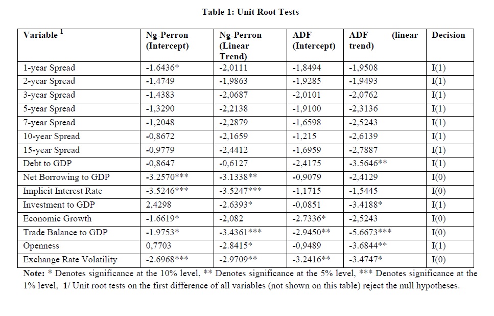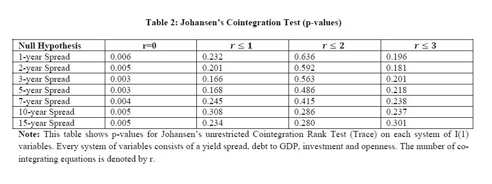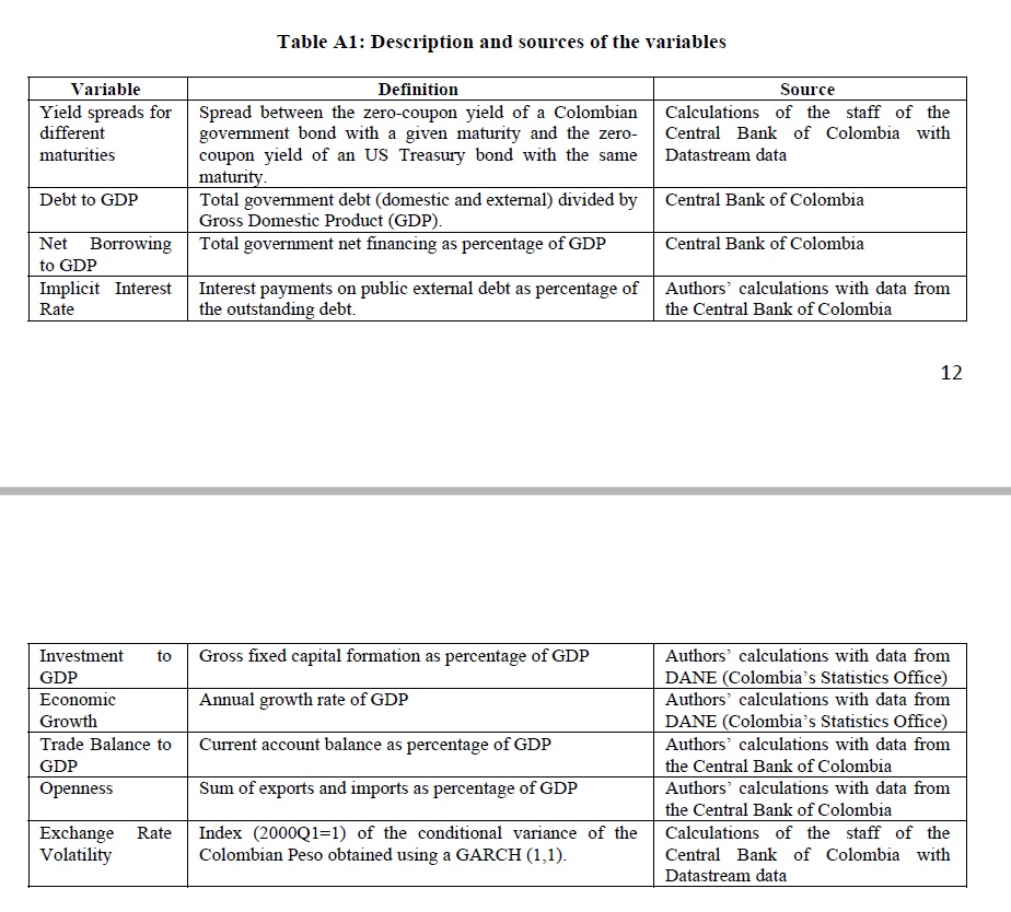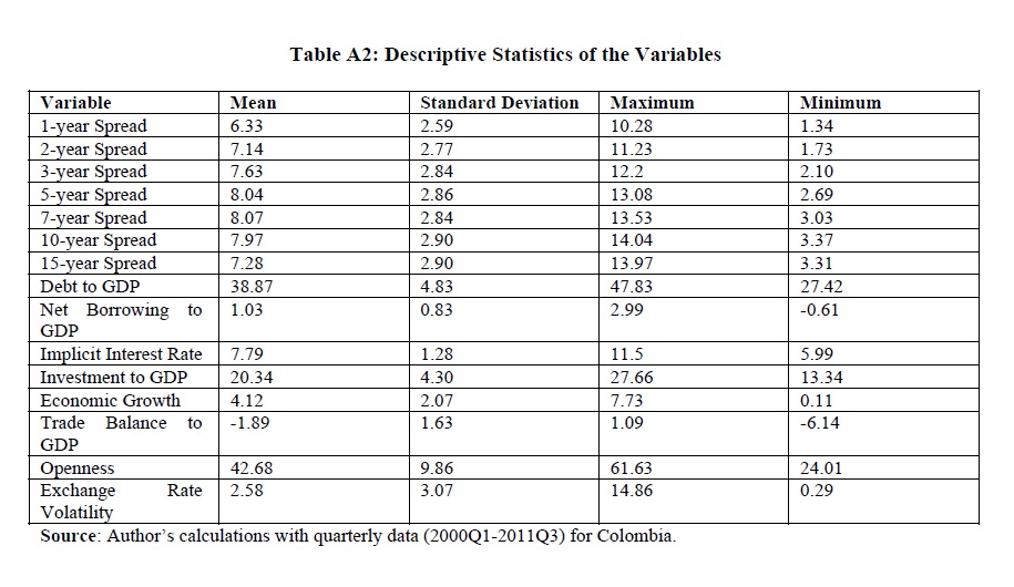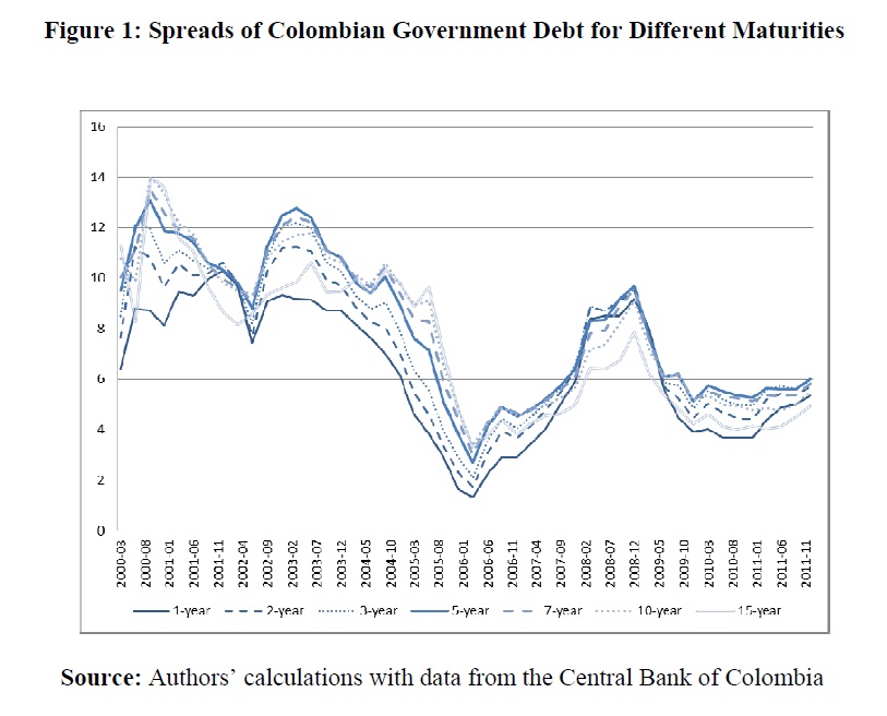 We study the determinants of sovereign default risk in Colombia by focusing on different time spans of risk which are indicated by yield spreads of government bonds with different maturities. Cointegration regressions are performed to analyze whether the