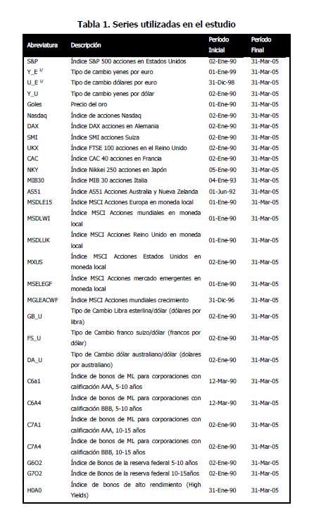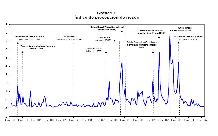 En este documento se construye un Índice de percepción de riesgo de los inversionistas institucionales en los mercados industrializados. Este índice se estima con base en un modelo de análisis factorial dinámico, que explora las tendencias comunes de las volatilidades de los retornos de una canasta de bonos, acciones y monedas de economías desarrolladas para el periodo comprendido entre 01 de 1990 y 03 de 2005. Se encuentra que en la 05ría de episodios críticos el índice aumenta, reflejando un incremento en el riesgo percibido por los inversionistas. Adicionalmente, se encuentra que muchos de los deterioros fuertes del riesgo país (medidos por incrementos en el EMBI+) están asociados con aumentos en este índice. La explicación es que la percepción de riesgo afecta las decisiones de inversión de los inversionistas institucionales en bonos de países emergentes y en general en activos riesgosos.