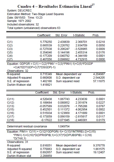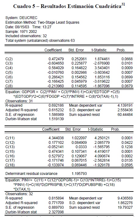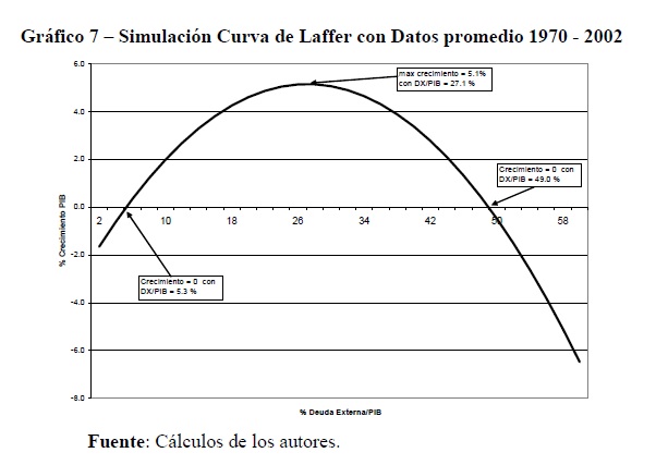 Este trabajo examina la relación entre la deuda externa, la inversión privada y el crecimiento para Colombia en el período 1970 – 2002. Se utilizaron dos especificaciones, una en donde las ecuaciones de crecimiento e inversión son lineales, y otra en la cual la relación entre deuda externa y crecimiento es de tipo curva de Laffer. Estas ecuaciones fueron estimadas simultáneamente mediante mínimos cuadrados en dos etapas con variables instrumentales. Los resultados indican que en la especificación lineal, la deuda externa como proporción del PIB tiene una relación negativa con el crecimiento en la cual un incremento de 5.6 puntos en el indicador de deuda se asocia con una caída de un punto en la tasa de crecimiento del producto. Adicionalmente, se encontró una relación cuadrática en la cual la deuda externa tiene un efecto negativo a partir de un nivel de endeudamiento de 27.1 puntos del PIB. Finalmente, se halló que la inversión privada esta asociada directamente con el flujo de endeudamiento privado e inversamente con el endeudamiento externo público.
