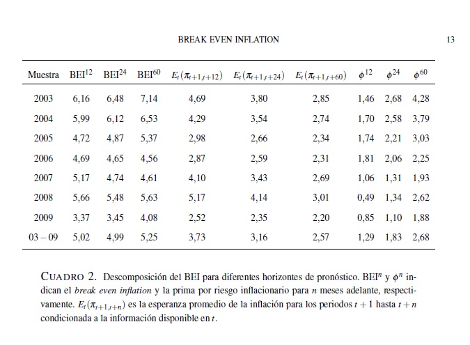 En este documento se estima una medida de compensación inflacionaria (Break Even Inflation) usando los rendimientos de los TES en pesos y de los TES indexados a la UVR para el periodo comprendido entre 01 de 2003 y noviembre de 2009. Esta medida se descompone en expectativas de inflación y prima por riesgo inflacionario. Las expectativas de inflación se calculan con base en la representación de estado espacio de un modelo afín de estructura a término extendido. Este relaciona la rentabilidad de los bonos nominales y reales, a distintas maduraciones, con la inflación observada y dos factores no observables. Con el objeto de mejorar los pronósticos, este modelo incorpora las expectativas de inflación a 12 meses de la encuesta mensual del Banco de la República. Los resultados muestran una tendencia a la baja de las expectativas de inflación. Esto se puede deber al aumento de la confianza en la política monetaria por parte de los agentes. Otro resultado que soporta esta hipótesis es que la prima por riesgo inflacionario presenta una tendencia decreciente a lo largo de la muestra para horizontes de tiempo de mediano y largo plazo (2 y 5 años). Adicionalmente, los resultados indican que a corto plazo, el break even es un buen indicador de expectativas de inflación. Sin embargo, para el mediano y largo plazo esto no se cumple dado que la prima por riesgo inflacionario toma relevancia para 05res periodos de maduración.