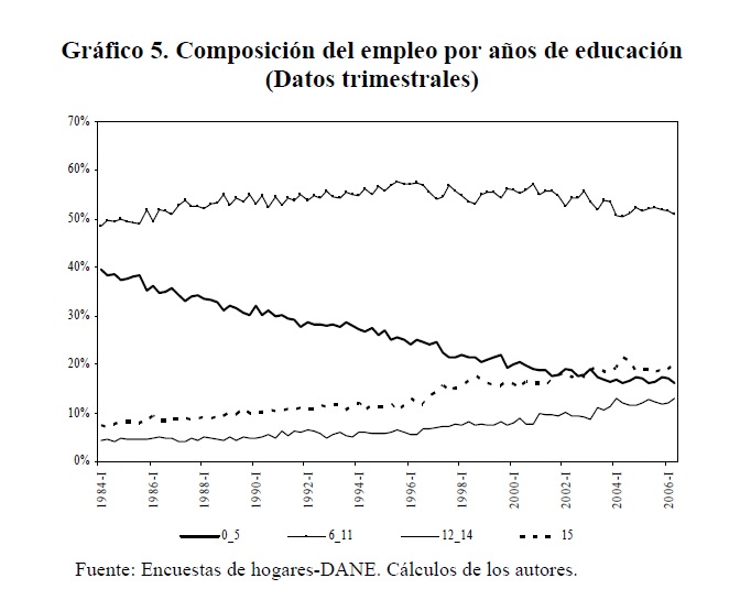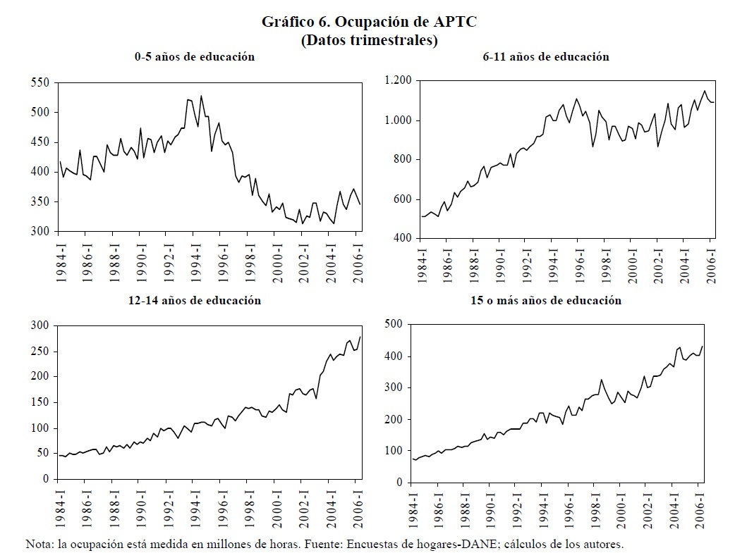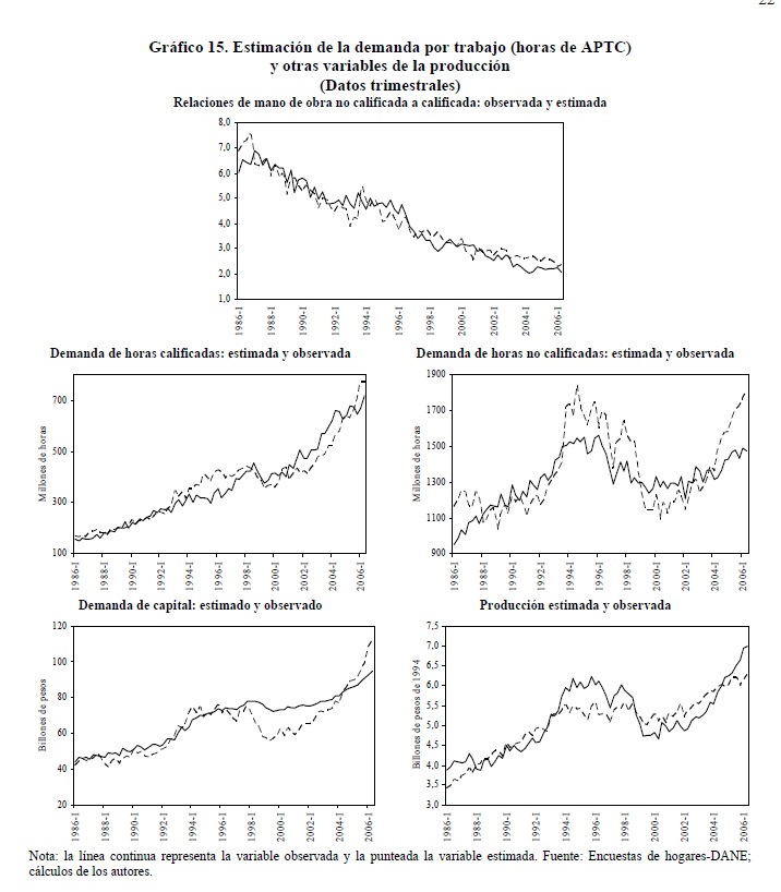 Se hallan las funciones de demanda por trabajo calificado (número horas laboradas por personas que tienen doce o más años de educación) y no calificado (número de horas laboradas por personas que tienen a lo sumo once años de educación) a partir de un proceso de minimización de costos de una firma representativa del sector urbano formal no gubernamental que emplea una tecnología de producción CES de dos niveles en la que se utilizan capital y trabajo diferenciado por años de educación. El período muestral va de 1986 a 2006. Tanto los salarios de cada tipo de trabajo como la tasa de interés, el cambio técnico y el producto constituyen las variables fundamentales que explican la evolución de la demanda de trabajo calificado y no calificado en el largo plazo. En el período 2003 ? 2006, la elasticidad de la demanda de trabajo calificado a su salario es -0,30 en tanto que la del trabajo no calificado es -0,33. La elasticidad de la demanda factorial al producto es 1,218.