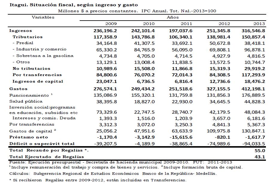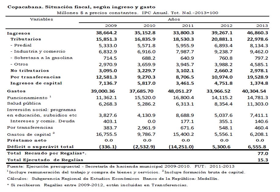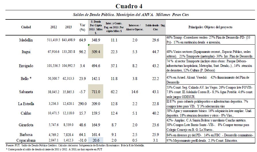 Within the metropolitan area of Medellin, the central administration of Sabaneta, has the highest per capita incomes (two million COP in 2013), four times more than Caldas and three more than Copacabana, Barbosa, Bello and Girardota; followed by Medellín