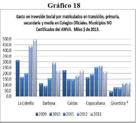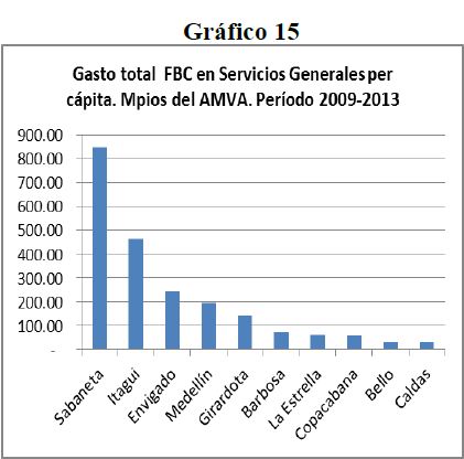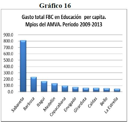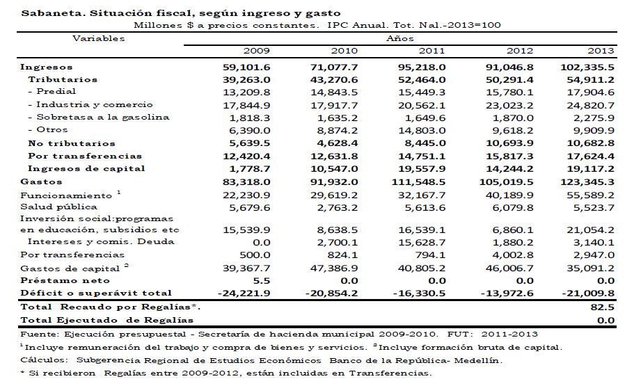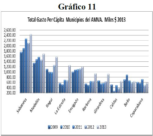 Dentro del área Metropolitana de Medellín, la administración central de Sabaneta, cuenta con los 05res ingresos per cápita (dos millones de pesos anuales en 2013), cuatro veces más que Caldas y tres que Copacabana, Barbosa, Bello y Girardota; Le siguieron Medellín, con $1.5 millones, y Envigado e Itaguí con un promedio de $1.2 millones. Sin embargo la mejor dinámica en el recaudo, la presentó el municipio de la Estrella (73% entre 2009-2013); mientras que Bello lo redujo en 26%. Los recursos de Sabaneta, se sustentan en su esfuerzo fiscal; en la certificación en educación otorgada en 2010 (lo que le permitió elevar el gasto por alumno matriculado en educación pública en 163% entre 2009 y 2013.) y, aunque temporales, en los ingresos por ventas de terrenos y otros aportes de cofinanciación. Su gasto total por habitante, fue el más alto. Destinó hacia la Formación Bruta de Capital, un promedio de $804.600 pesos por habitante, seguido por Medellín ($348.400). En Salud pública, en 2013, ejecutó un promedio de $1.2 millones por cada afiliado al régimen subsidiado que cubrieron el 9,4% de la población.
