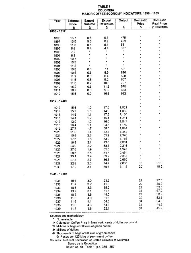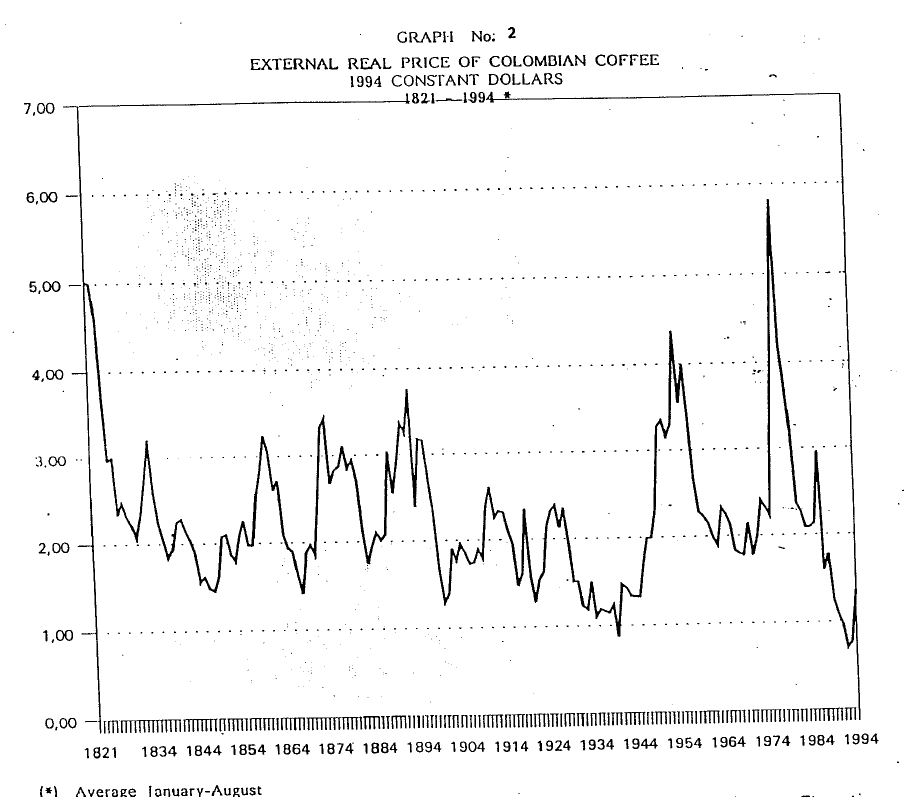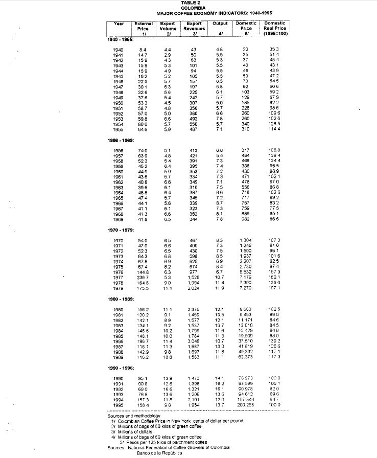 The analysis of the impacts of coffe bonanzas and crisis on the Colombian economy, given its importance, has been one of the favorite topics of research both by colombian and foreign economists, Cárdenas(1991);Carkovic (1992); Cuddington (1986); Ocampo (1994); Posada(1992);Urrutia and Suescún(1994). The political economy aspects behind the policy response by colombian authorities has not had similar emphasis in the literature. Such is the topic of this paper. The article stars with a historical overview of the international coffee price with the purpose of identifying the major periods of bonanzas and crissi. In a chronological pattern, the paper discusses the main institutional and political economy issues that took place then and the extent to which they may explain the macroeconomic response to bonanzas and crisis. The paper singles out the key role traditionally played by the coffee growers represented through the National Federation of Coffee Growers and poses the question of what should be its future role, in a country where coffee has lost its importance in foreign exchange earnings and in GDP, but where the coffee activity continues to be an important source of rural employment and where the coffee producers maintain a political and economic leadership in key regions of the country.