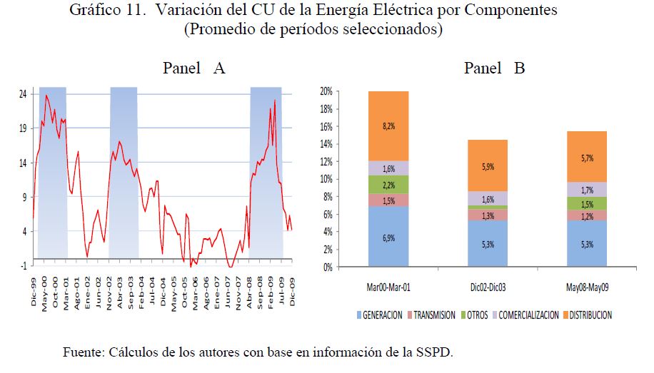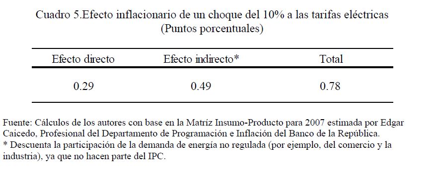 | dc.description | En Colombia, las tarifas de la energía eléctrica son reguladas por el Estado. En la provisión del servicio participan cuatro negocios independientes (generación, transmisión, distribución y comercialización), cuyas empresas enfrentan distintas condiciones de mercado. Las tarifas se fijan con base en el costo unitario, el cual se ajusta, en cierto grado, con los principales índices de precios de la economía. Este documento describe el mercado colombiano de la energía eléctrica, analiza el proceso de formación de las tarifas, caracteriza su comportamiento y cuantifica el impacto inflacionario de un choque a la tarifa, con el fin de que sirva de referencia para los pronósticos de inflación y la toma de decisiones de política. Se encuentra que durante la última década las tarifas registraron cambios mensuales asimétricos y que frente a un choque del 10% en este precio, la inflación anual aumenta en 0,78%. | spa |