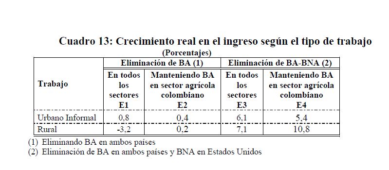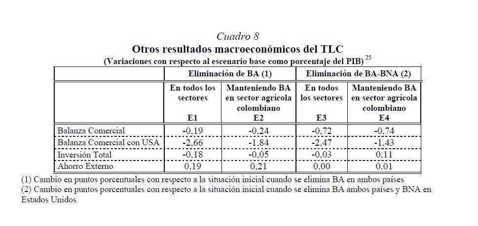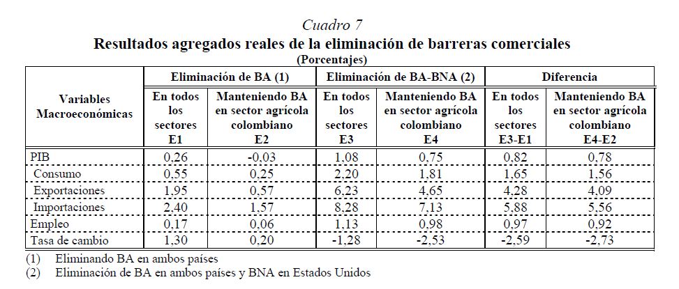 En este trabajo se hace una evaluación cuantitativa de los posibles efectos de un acuerdo de libre comercio (TLC) con Estados Unidos sobre la economía colombiana. Con este objetivo se utiliza un modelo de equilibrio general que representa el funcionamiento de la economía colombiana en condiciones de sustitución imperfecta entre los bienes domésticos y los bienes importados y exportados, rigideces salariales en el mercado laboral, y competencia imperfecta en los sectores industriales.Los resultados muestran que los efectos de un TLC sobre la economía colombiana dependen críticamente del grado en el cual se logren afectar las barreras no arancelarias vigentes en los Estados Unidos. Un TLC con disminución en estas barreras no arancelarias beneficiaría a los más pobres y tendría un efecto progresivo sobre la distribución del ingreso, contrario a lo que sostienen diferentes críticos. Sin embargo, esto depende del alcance del acuerdo. En especial, un TLC que mantenga las BNA sobre el sector agrícola en Estados Unidos tendría efectos negativos sobre los ingresos y el consumo de los trabajadores rurales, y en general sobre el sector agrícola colombiano.