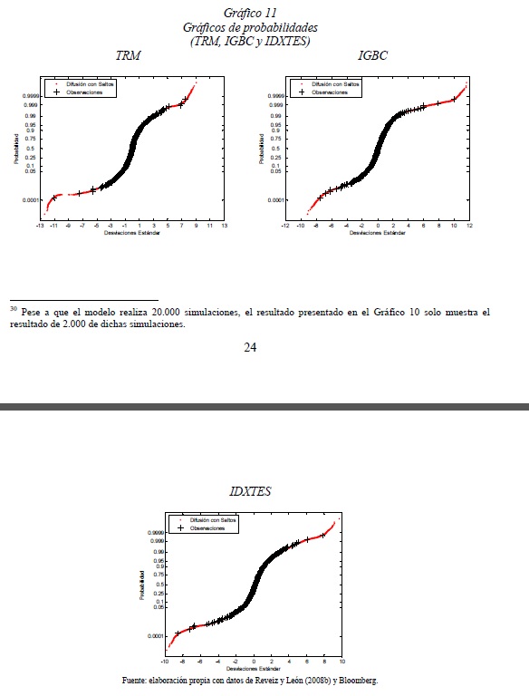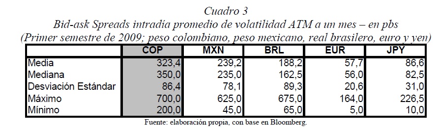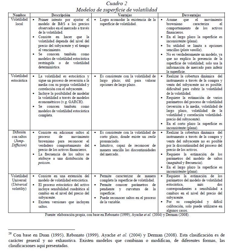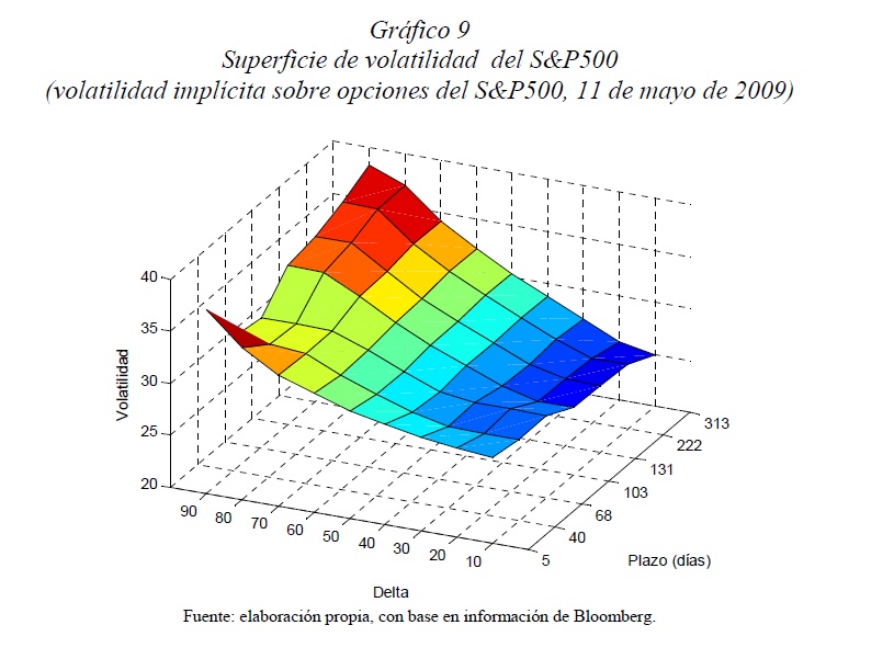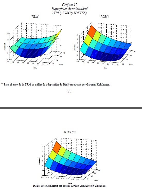Las opciones no solo son instrumentos que ofrecen la oportunidad de cubrir o aprovechar cambios direccionales en el precio del activo subyacente, sino que permiten valorar la volatilidad de este. En mercados desarrollados es posible identificar que los agentes sobrevaloran o subvaloran la volatilidad de opciones cuyo precio de ejercicio se aleja del precio del subyacente o cuyo vencimiento se aleja del presente, lo cual resulta en una superficie de volatilidad. Este es un hecho característico y bien conocido, que contradice al modelo más exitoso para valorar opciones (Black y Scholes) y a uno de los supuestos centrales de las finanzas modernas. En atención al bajo desarrollo del mercado de opciones colombiano, este documento pretende modelar la superficie de volatilidad en el mercado cambiario, de renta fija y variable, para lo cual se utiliza una aproximación teórica basada en el modelo de difusión con saltos. La aplicación del modelo propuesto consiguió capturar el comportamiento empírico de dichos mercados, lo cual a su vez resultó en que las superficies de volatilidad obtenidas sean intuitivas y coincidan con lo observado en mercados desarrollados. Las superficies de volatilidad obtenidas pueden servir como punto de partida teórico para valorar opciones y ofrecer nuevos productos financieros, mientras que la habilidad del modelo de difusión con saltos para capturar eventos extremos puede ser de utilidad para otros propósitos, tales como la evaluación de riesgo de mercado.