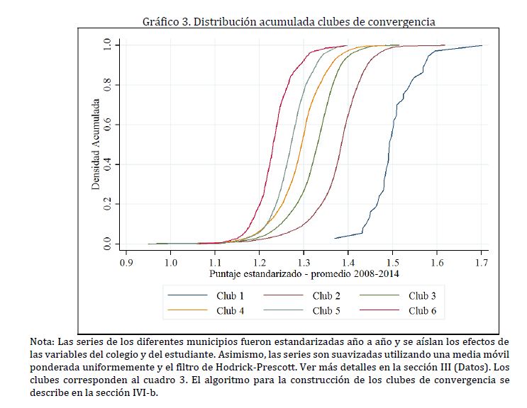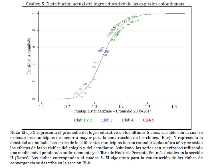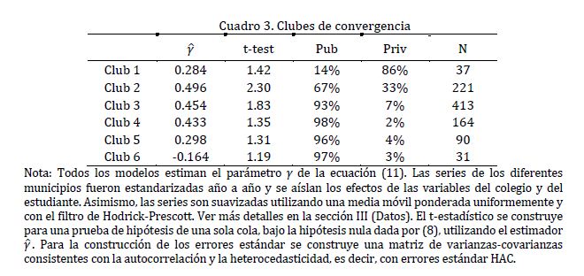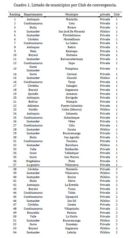 Este documento evalúa la convergencia a nivel municipal en el logro educativo de los colegios públicos y privados en el período 1980-2014, usando el test de Phillips y Sul (2007, 2009). Aunque los principios que dictaminan la provisión de educación pública son homogéneos en todo el país, y los esfuerzos que la descentralización de competencias y recursos hace para compensar las diferencias regionales, el logro educativo promedio de los diferentes municipios no evidencia patrones de convergencia global. No obstante, se establece la presencia de seis clubes de convergencia. Los primeros dos clubes, los cuales incluyen los municipios con mejor desempeño, están desproporcionalmente representados por colegios privados en municipios localizados en las principales áreas metropolitanas del país, mientras que los últimos tres clubes están compuestos principalmente por colegios públicos localizados en el litoral Pacífico y en la región Caribe. De esta forma, se hace evidente la necesidad de implementar reformas nacionales que no solo descentralicen el gasto, sino que también creen mecanismos que permitan mejorar la productividad en la provisión de servicios de educación de las diferentes regiones del país.