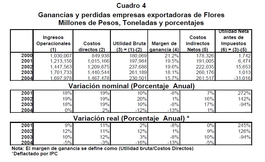 Por varias décadas el sector floricultor colombiano ha contribuido a la generación de divisas y a la modernización de su mercado de trabajo. Recientemente, atraviesa por una difícil situación económica, marcada por pérdidas crecientes de un grupo también en aumento de productores. Existe también un porcentaje importante que continúan obteniendo ganancias en su negocio, auque a tasas bajas. El presente trabajo explora los factores que ayudan a explicar dicha situación en el período 2000-2005. Se analizan las características del mercado de exportación, la producción nacional y, para una muestra de 146 empresas, la evolución de los ingresos operacionales, costos, utilidades y rentabilidad. Los resultados indican que la coyuntura actual puede asociarse a la evolución reciente de la tasa de cambio y la consiguiente revaluación del peso que ha afectado los ingresos de los exportadores de flores, en particular en el año 2004; y a los altos costos directos, afectados especialmente por salarios reales y costos de transporte e insumos.
