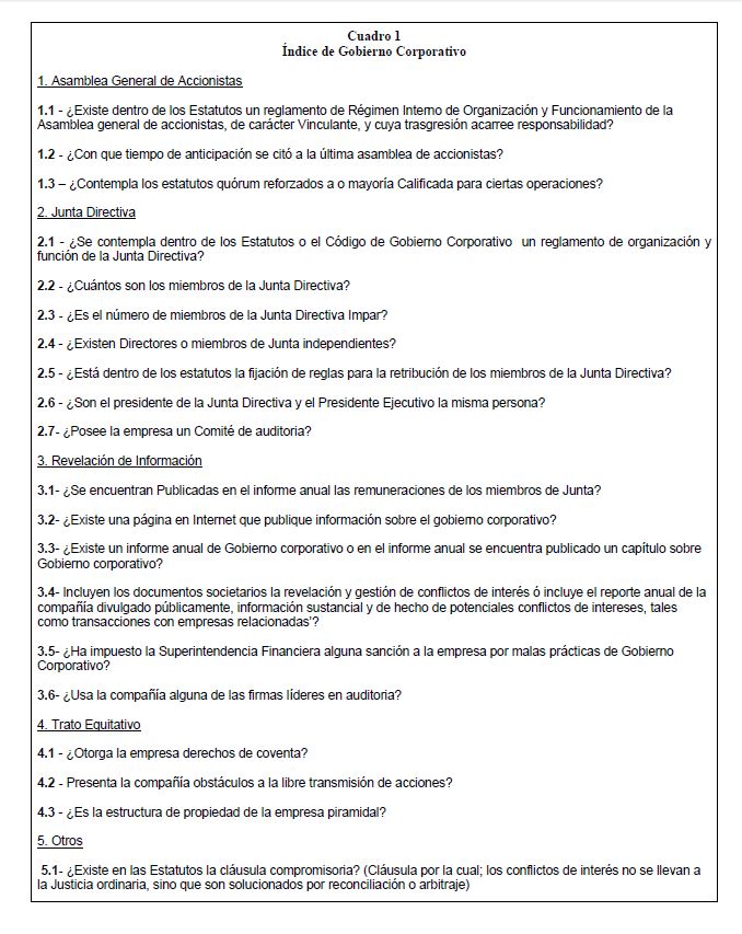 | dc.description | El trabajo evalúa el estado de las prácticas de gobierno corporativo en las empresas que negocian acciones ordinarias en la Bolsa de Colombia. Esta tarea se lleva a cabo mediante la construcción de un Índice de Gobierno Corporativo construido con información pública. Por otra parte se mide el impacto que las buenas prácticas de gobierno corporativo tienen sobre la relación del valor de mercado al valor en libros de las empresas ("q" de Tobin). | spa |