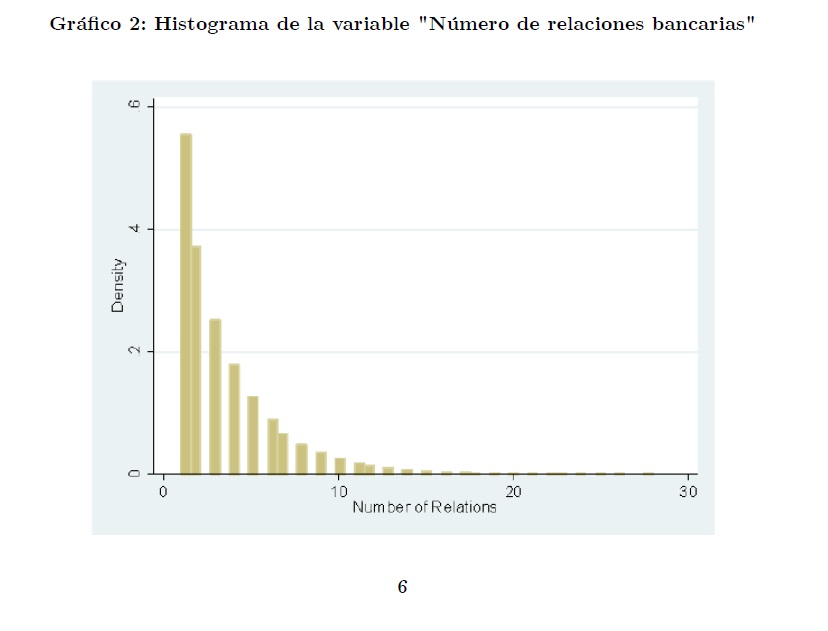 En este documento se realiza una exploración inicial sobre los determinantes del número de relaciones bancarias del sector corporativo privado de Colombia. Siguiendo otros estudios similares que se han realizado para distintos países, se utilizan modelos de datos de cuenta y se estima un modelo de regresión Poisson y un modelo de regresión Binomial Negativo para hallar los determinantes de la variable de interés. Encontramos que los datos presentan sobredispersión, razón por la cual el modelo de regresión Binomial Negativo es más adecuado que el modelo de regresión Poisson en este contexto. Dentro de este ejercicio se encuentra que las variables de liquidez, tamaño de la firma, composición de la deuda, eficiencia, la tasa activa real y la tasa de crecimiento del PIB, resultan ser importantes en la determinación del número de relaciones bancarias. El hecho que las relaciones bancarias sean afectadas por la actividad económica podría sugerir que durante los tiempos de desaceleración económica las empresas buscan fuentes alternativas de financiamiento.