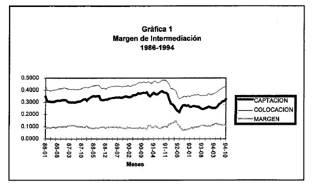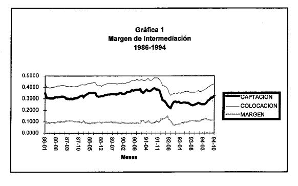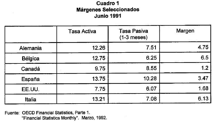 En Colombia, el margen entre las tasas de interés activas y pasivas estuvo en un 9.9% en promedio para el período 1986-1994. La gráfica 1 muestra un máximo de 14.9% y un mínimo de 7.12%. Este margen es comparativamente alto respecto a los observados en Costa Rica, del 5.2%, del 4.5% en Chile y del 1.7% en los Estados Unidos y sugiere un problema en la asignación de recursos (1). El cuadro 1 muestra las tasas de interés activas y pasivas para seis países industrializados en 1991, para los cuales el margen comparable más alto es el belga de 6.5% (2).