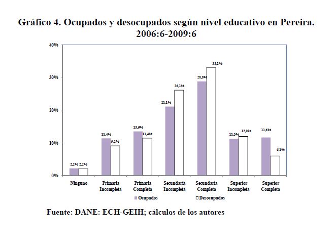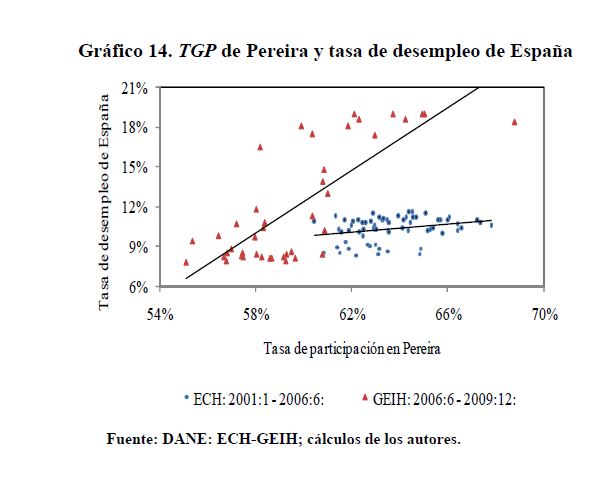 Este documento tiene como objetivo establecer las causas que han llevado a Pereira a ubicarse como la ciudad con la tasa de desempleo más alta, entre las 13 principales ciudades de Colombia. Para ello, se presentan estimaciones econométricas de modelos de participación y demanda laboral, utilizando información de las 13 principales ciudades y sus áreas metropolitanas reportadas en la Encuesta Continua de Hogares para los períodos 2001:01 a 2006:06 y la Gran Encuesta Integrada de Hogares para los períodos 2006:07 a 2009:12. Nuestros resultados indican que, en buena medida, la alta tasa de desempleo de Pereira se explica por la crisis de España ya que su tasa de desempleo y las remesas que provienen de allí afectan la probabilidad de participar en el mercado de trabajo de Pereira. Desde el punto de vista de la demanda de trabajo, los aumentos del salario mínimo pueden ser incompatibles con el bajo nivel educativo de la población y hacer que la mano de obra parezca costosa en relación con su productividad.