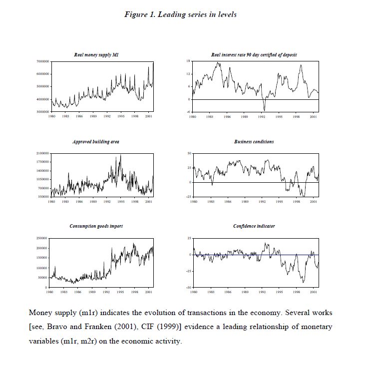 | dc.description.abstract | In this paper, we propose a methodology for calculating a leading index of the economic activity based on a modification of Stock and Watson’s (1989, 1991, 1992) approach. We use Kalman filter techniques for estimating the state space representation of th | eng |