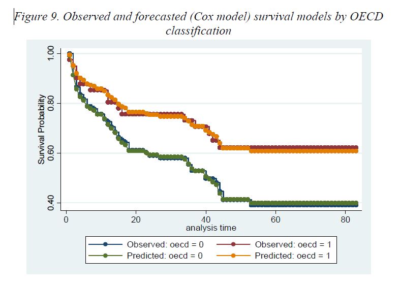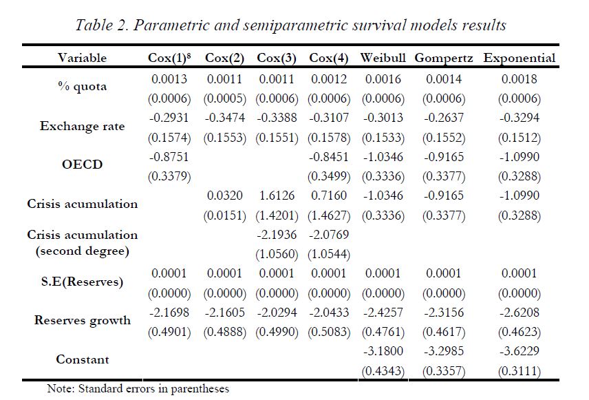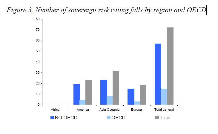 La dinámica del sistema financiero es una señal de crecimiento económico, por lo tanto es un indicador clave para los inversionistas. Por lo tanto, uno de los principales retos de la política económica es mantener la estabilidad así como proteger el sistema financiero de los fenómenos externos. La actividad financiera y la actividad económica son en general susceptibles a las crisis y dicho riesgo puede medirse a partir de la calificación de deuda de largo plazo. A través de esta variable proponemos aplicar el análisis de sobrevivencia, para explorar la duración de las caídas en la calificación de riesgo y la capacidad de variables macroeconómicas para predecirlas. Con ello se encontraron diferencias importantes en las economías desarrolladas y emergentes, teniendo en cuenta variables de riesgo cambiario y endeudamiento de la economía.