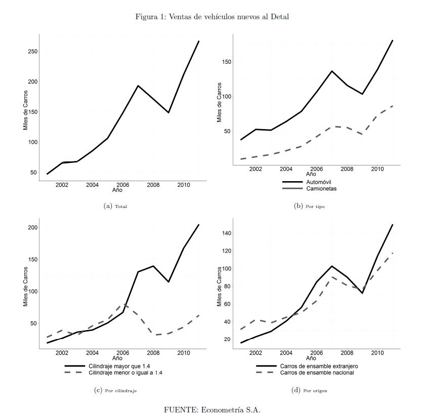 The objective of this paper is the evaluation of the effect of tax policies, the exchange rate and household income on new car demand in Colombia between 2001 and 2011. During these years car sales increased and the composition of vehicle sales changed su
