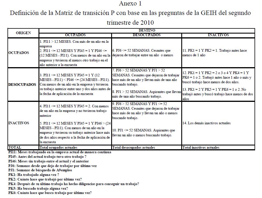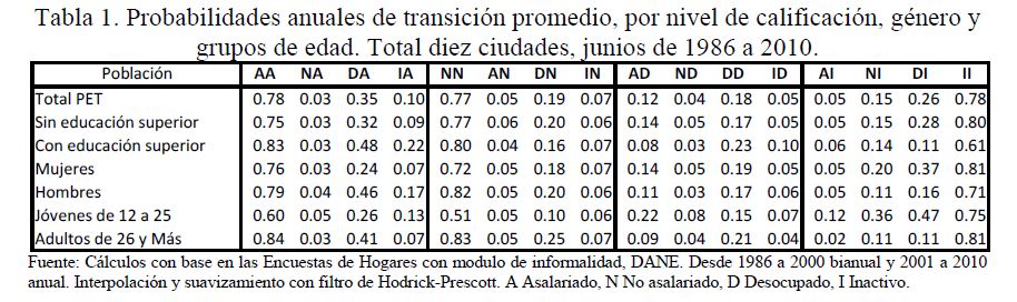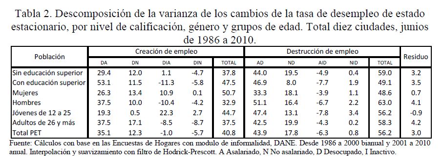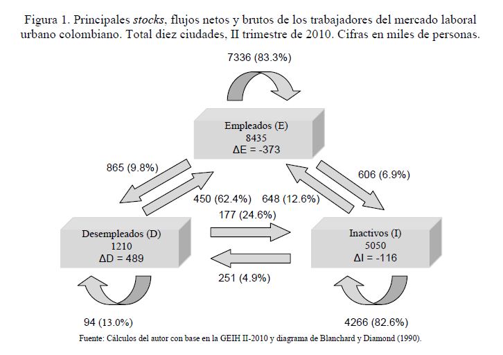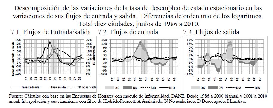 El desempleo varía sustancialmente en el tiempo y para diferentes grupos de trabajadores. Los flujos brutos de trabajadores entre los diferentes estados del mercado de trabajo son factores determinantes de estas variaciones. En este trabajo se investiga cómo los cambios en los flujos brutos del mercado laboral forman los movimientos cíclicos del desempleo a través del tiempo y cómo afectan a los diferentes grupos de trabajadores.Un factor determinante de la dinámica y la persistencia del desempleo en niveles altos es que la destrucción de empleo excedió la creación de empleo en los últimos veinticinco años. El 56% de la varianza de los cambios de la tasa de desempleo se debe al cambio en el flujo de pérdidas de empleo, mientras el 41% se explica por el cambio en el flujo de trabajadores que consiguen empleo. A través del tiempo, el cambio en el flujo de pérdidas de empleo lideró con dos años de adelanto el cambio de pendiente de la tasa de desempleo, y contrario a buena parte de la evidencia internacional, fue superior durante los años de mejores desempeños de la actividad agregada; mientras el cambio en el flujo de trabajadores con éxito en la búsqueda de empleo fue pro-cíclico con respecto a la tasa de desempleo. Por otro lado, la movilidad del mercado laboral urbano colombiano tuvo una tendencia creciente desde los primeros años de la década anterior, donde dos de cada cinco trabajadores asalariados sin educación superior cambiaron de empleo durante lo corrido de un año, y al final de la década, uno de cada dos tuvieron esta condición, lo que da señales sobre la creciente flexibilidad y la 05r dinámica del mercado laboral de Colombia.