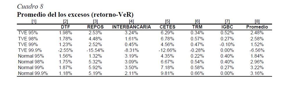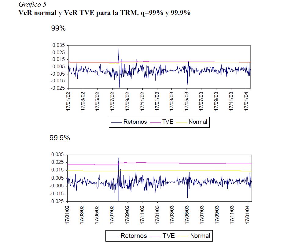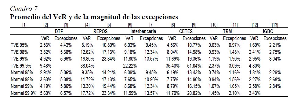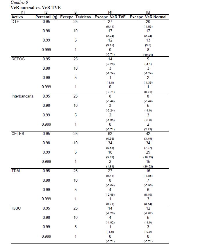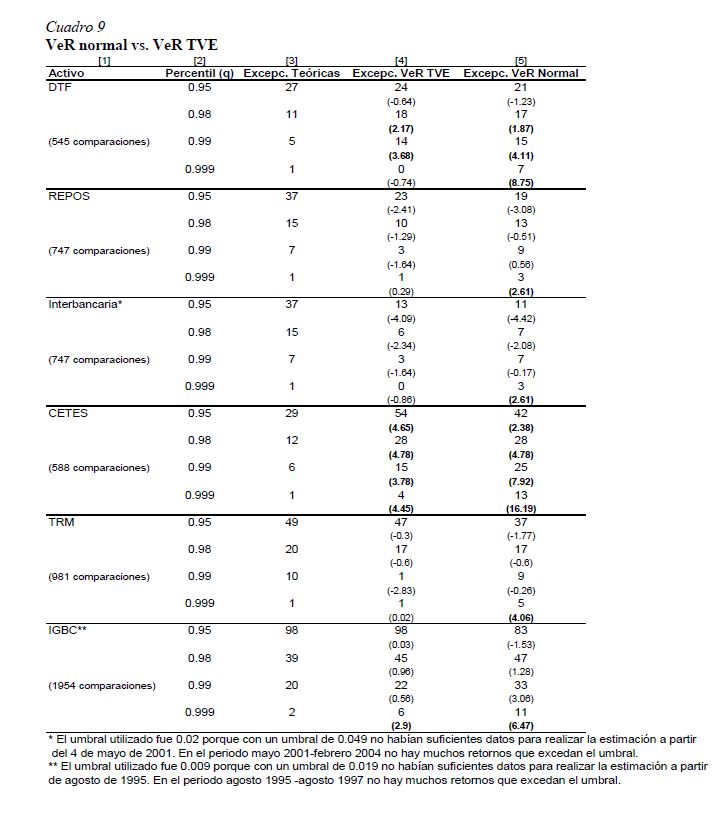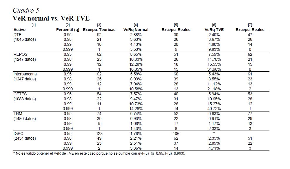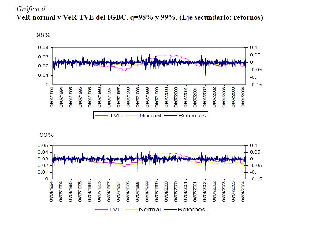 Desde finales de los años 80 el sistema financiero colombiano ha experimentado cambios fundamentales acompañados de una 05r volatilidad del entorno en que se desenvuelve la actividad financiera. Como parte del fortalecimiento de la regulación prudencial, desde el 2000 en Colombia, se está supervisando el riesgo de mercado medido a través del Valor en Riesgo (VeR). El VeR se define como la máxima pérdida potencial en el valor de un activo o portafolio, dada una probabilidad, debido a cambios en los precios del mercado, en un horizonte de tiempo determinado. Para obtener el VeR de un activo generalmente se supone que los retornos siguen una distribución normal, sin embargo existe gran evidencia de que ésta no se ajusta en forma correcta a la serie de retornos financieros. En este estudio se utiliza la teoría de valor extremo (TVE) para obtener el VeR de 6 activos financieros colombianos utilizando el método de Picos sobre un umbral (Peaks over Thresholds (POT)) mostrando que la distribución normal no se ajusta a la distribución de los retornos de los activos colombianos. Se modela de forma satisfactoria la distribución de las series, bajo el supuesto de observaciones independientes e idénticamente distribuidas, especialmente en la parte extrema de la distribución. Se compara el VeR obtenido (VeR TVE) y el VeR bajo el supuesto de distribución normal con los retornos reales dando como resultado un mejor ajuste del VeR de TVE. En el último examen de desempeño, la hipótesis nula de que el modelo realiza una buena estimación es rechazada 11 veces por el método tradicional (distribución normal) mientras que el método de TVE lo hace 6 veces.