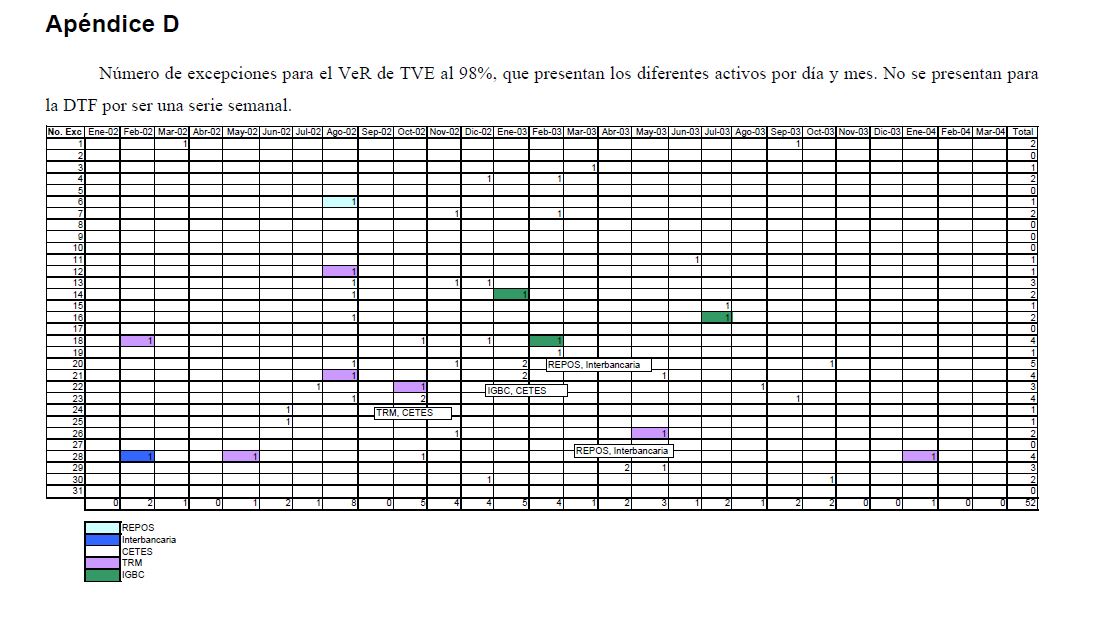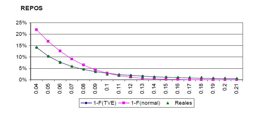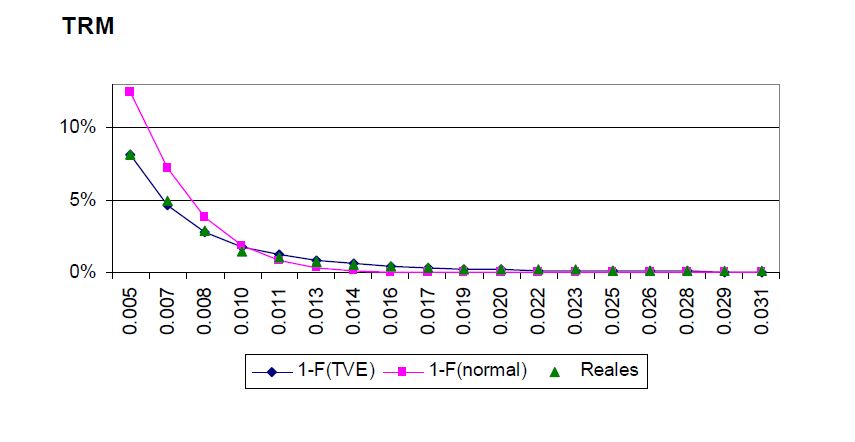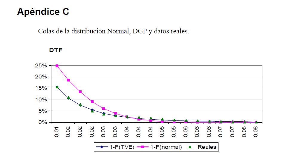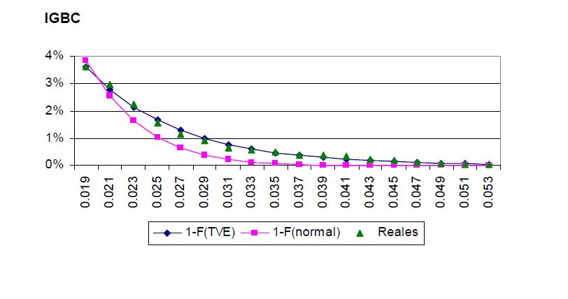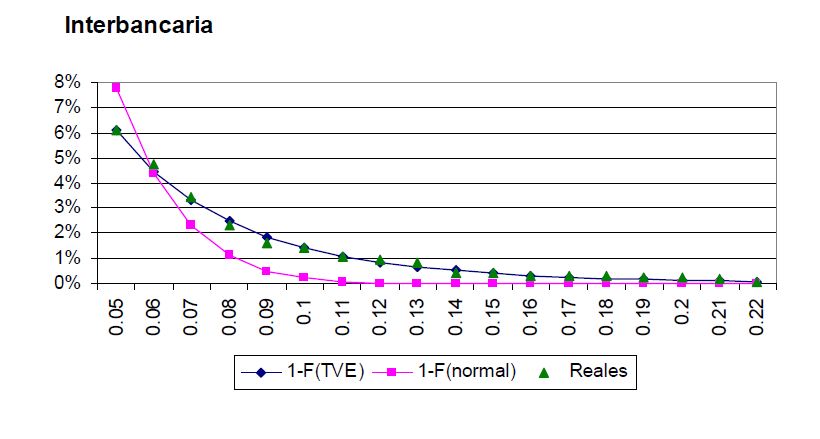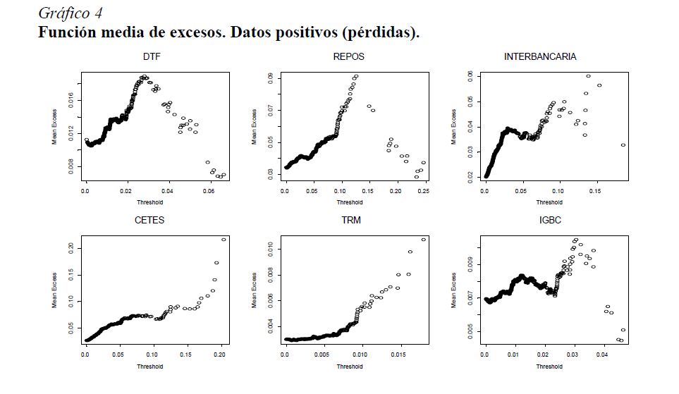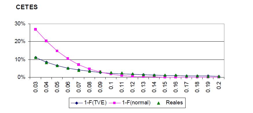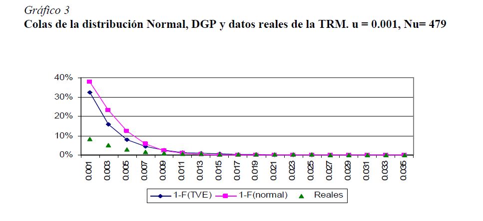 Desde finales de los años 80 el sistema financiero colombiano ha experimentado cambios fundamentales acompañados de una 05r volatilidad del entorno en que se desenvuelve la actividad financiera. Como parte del fortalecimiento de la regulación prudencial, desde el 2000 en Colombia, se está supervisando el riesgo de mercado medido a través del Valor en Riesgo (VeR). El VeR se define como la máxima pérdida potencial en el valor de un activo o portafolio, dada una probabilidad, debido a cambios en los precios del mercado, en un horizonte de tiempo determinado. Para obtener el VeR de un activo generalmente se supone que los retornos siguen una distribución normal, sin embargo existe gran evidencia de que ésta no se ajusta en forma correcta a la serie de retornos financieros. En este estudio se utiliza la teoría de valor extremo (TVE) para obtener el VeR de 6 activos financieros colombianos utilizando el método de Picos sobre un umbral (Peaks over Thresholds (POT)) mostrando que la distribución normal no se ajusta a la distribución de los retornos de los activos colombianos. Se modela de forma satisfactoria la distribución de las series, bajo el supuesto de observaciones independientes e idénticamente distribuidas, especialmente en la parte extrema de la distribución. Se compara el VeR obtenido (VeR TVE) y el VeR bajo el supuesto de distribución normal con los retornos reales dando como resultado un mejor ajuste del VeR de TVE. En el último examen de desempeño, la hipótesis nula de que el modelo realiza una buena estimación es rechazada 11 veces por el método tradicional (distribución normal) mientras que el método de TVE lo hace 6 veces.