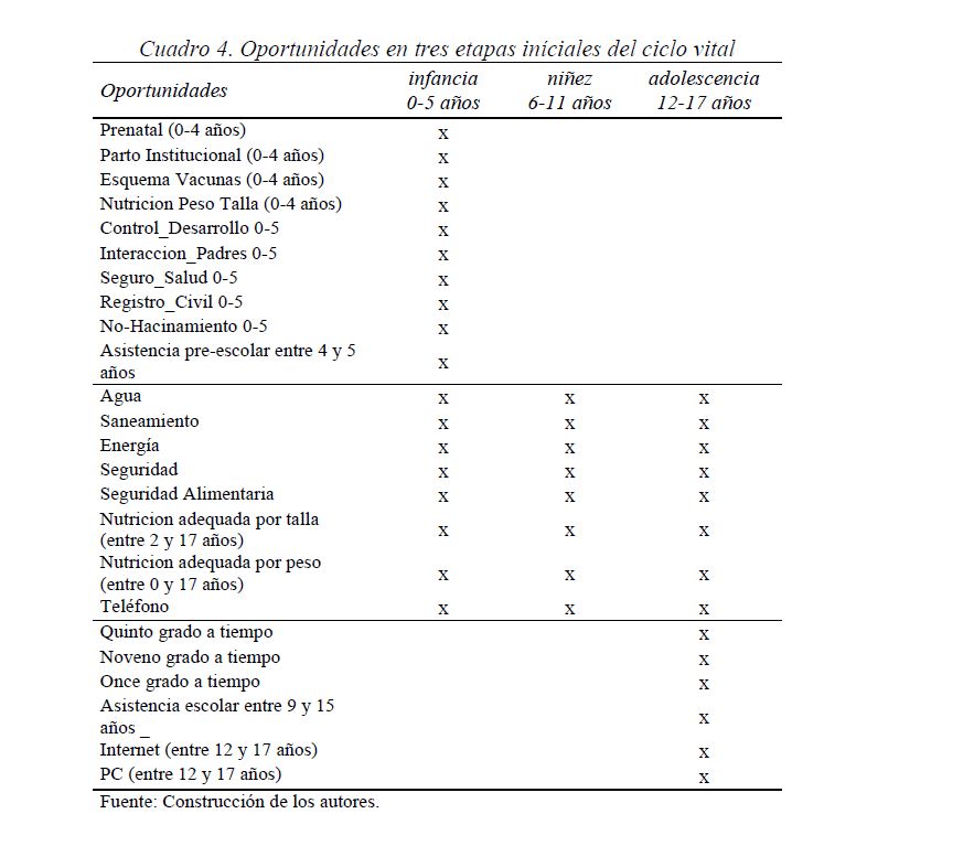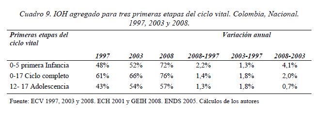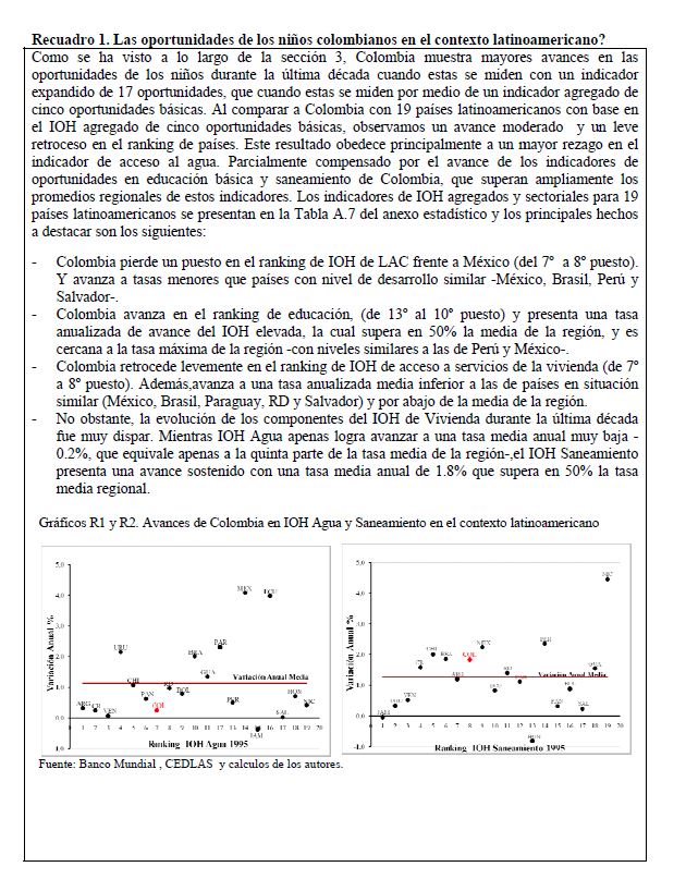 Colombia es un país con alta desigualdad de ingresos y la 05ría de sus ciudadanos considera inequitativa esta situación. De allí la relevancia de medir qué tan lejos está Colombia y sus regiones de un ideal de igualdad de oportunidades entre los niños y los jóvenes. Este documento busca establecer ¿Cuál ha sido el avance nacional y regional de la igualdad de oportunidades en la última década? ¿Cuáles son las circunstancias que están más estrechamente asociadas a la desigualdad de oportunidades de los niños colombianos? ¿En cuáles sectores se está ofreciendo 05r acceso a bienes y servicios básicos de vivienda, de educación, de salud y TICs, y a niveles adecuados de nutrición, independientemente de las circunstancias menos favorables del hogar y del lugar que ellos habitan? Durante la última década Colombia logró importantes avances en varios Índices de Oportunidades Humanas, pero aún subsisten considerables brechas de oportunidades entre niños en circunstancias favorables y desfavorables. Las siete 05res brechas de oportunidades se dan en la culminacion de educación primaria, media y secundaria a tiempo, en la Seguridad Alimentaria, en el acceso a Agua y Saneamiento, y en el acceso a Internet. En la comparación de regiones sobresalen los avances de la región Oriental (compuesta por los departamentos de Boyacá, Cundinamarca, Meta y Santanderes) y preocupa el atraso de las regiones Atlantica y Pacífica (particularmente en seguridad alimentaria). Cuatro circunstancias juegan un papel preponderante en la desigualdad de oportunidades: (i) educación de los padres, (ii) localización urbano-rural (AMs y Capitales de departamento, centros urbanos medianos y pequeños, y rural), (iii) la localización por Regiones, y, (iv) la presencia de hijos, ancianos y discapacitados en el hogar.