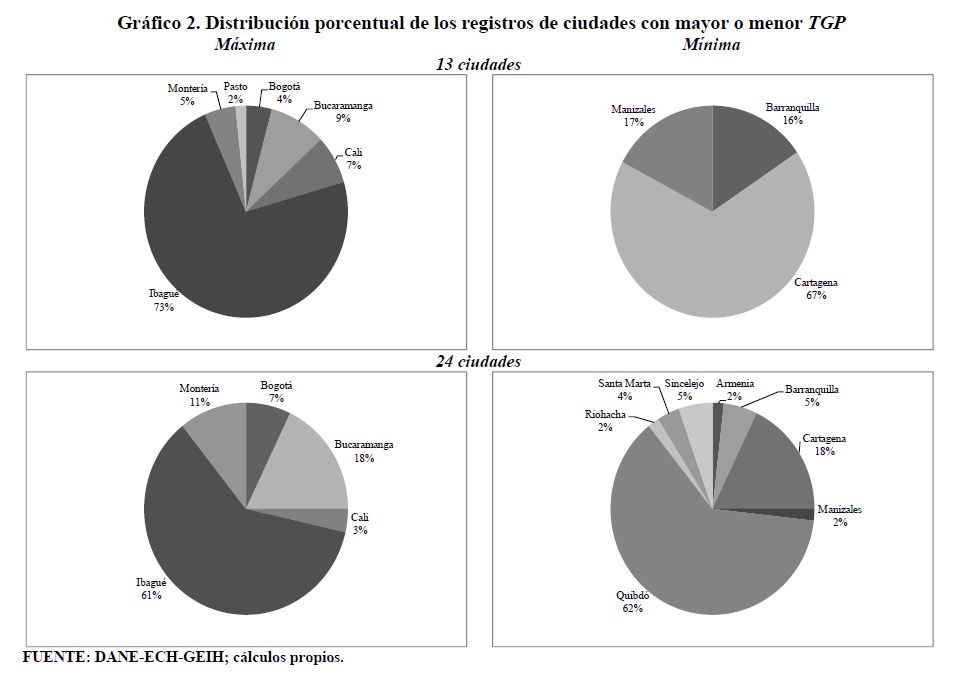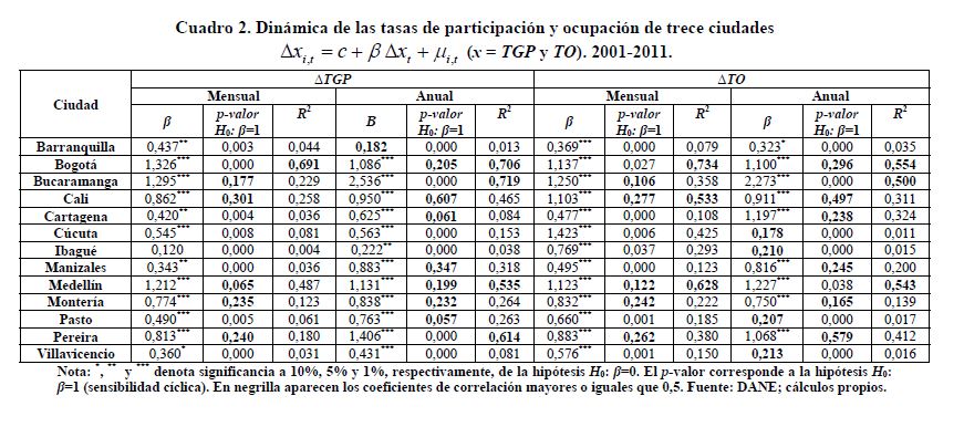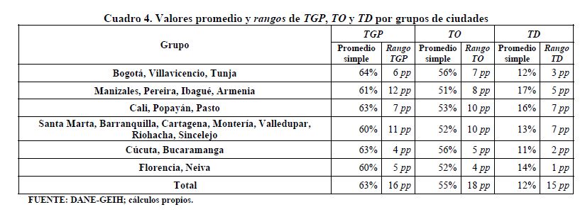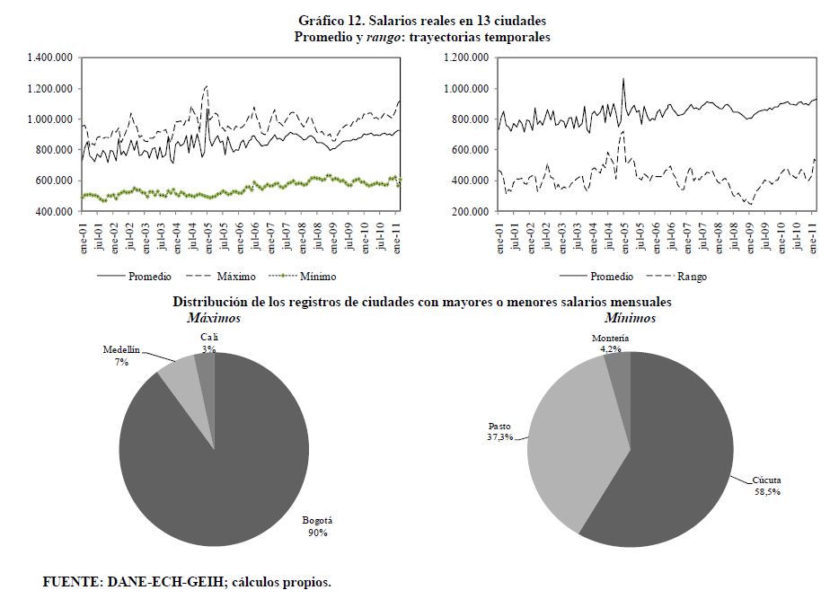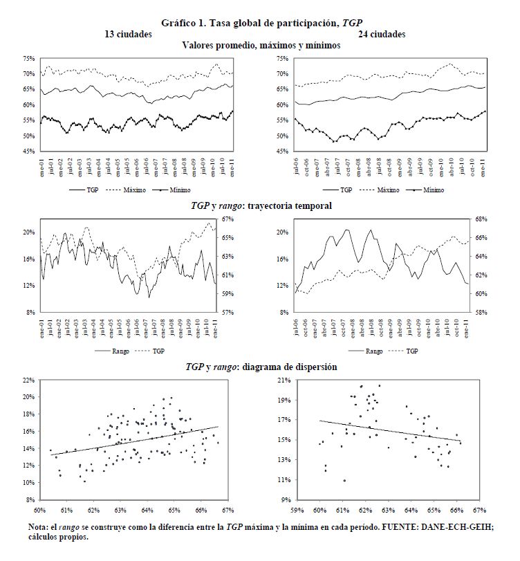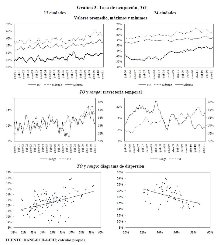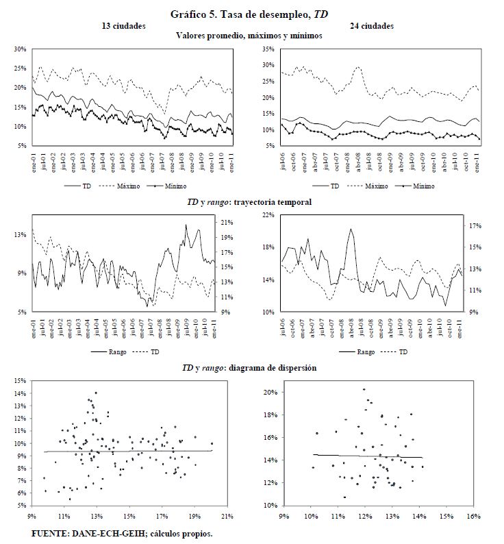 Se encuentran diferencias importantes entre ciudades en variables del mercado de trabajo de Colombia como las tasas de participación, ocupación, desempleo y salarios. Se construyen rangos para estas variables como la diferencia entre el valor más alto correspondiente a una ciudad y el valor más bajo correspondiente a otra ciudad. Los rangos de variación promedio desde 2001 hasta 2011 o desde 2006 hasta 2011 en cada una de estas variables son superiores a los 13 puntos porcentuales. Dichos rangos son sensibles al aumento de las tasas de participación y ocupación. Este hecho, en el caso de la tasa de desempleo, ha sido documentado para otros países. Sin embargo, en Colombia, contrario a lo que se presenta a nivel internacional, cuando la tasa de desempleo aumenta no se observa una respuesta sistemática del rango de esta variable. En los países analizados los rangos de las tasas de desempleo crecen al aumentar la tasa de desempleo.