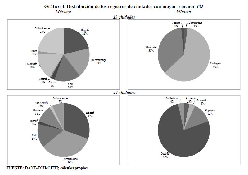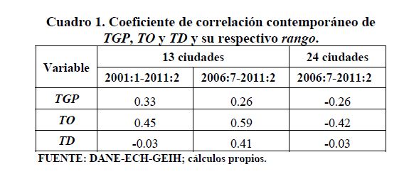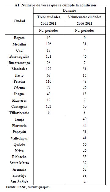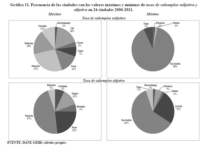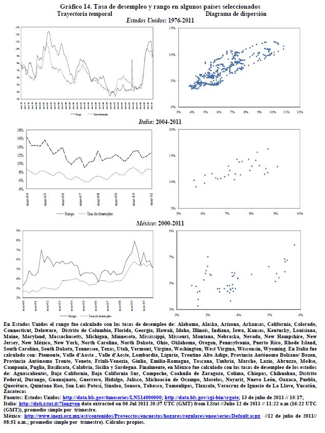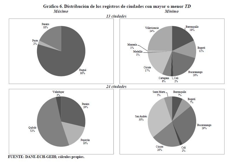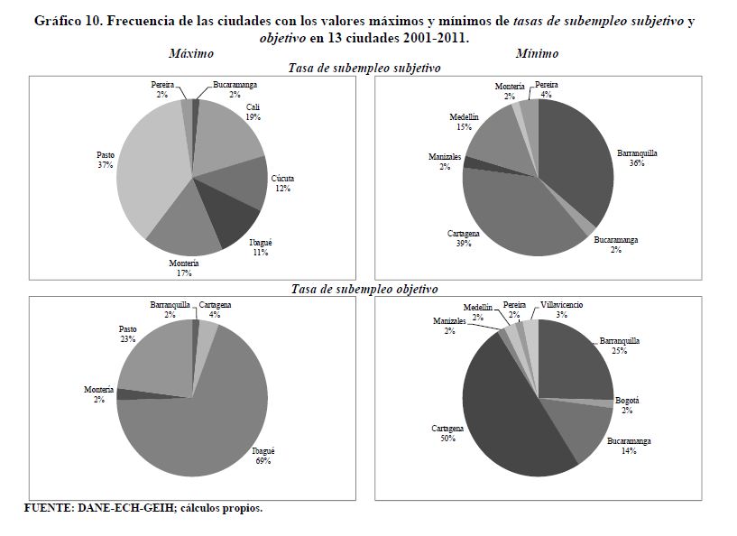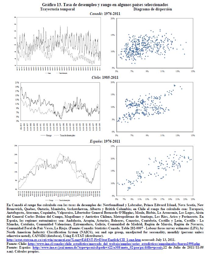 Se encuentran diferencias importantes entre ciudades en variables del mercado de trabajo de Colombia como las tasas de participación, ocupación, desempleo y salarios. Se construyen rangos para estas variables como la diferencia entre el valor más alto correspondiente a una ciudad y el valor más bajo correspondiente a otra ciudad. Los rangos de variación promedio desde 2001 hasta 2011 o desde 2006 hasta 2011 en cada una de estas variables son superiores a los 13 puntos porcentuales. Dichos rangos son sensibles al aumento de las tasas de participación y ocupación. Este hecho, en el caso de la tasa de desempleo, ha sido documentado para otros países. Sin embargo, en Colombia, contrario a lo que se presenta a nivel internacional, cuando la tasa de desempleo aumenta no se observa una respuesta sistemática del rango de esta variable. En los países analizados los rangos de las tasas de desempleo crecen al aumentar la tasa de desempleo.