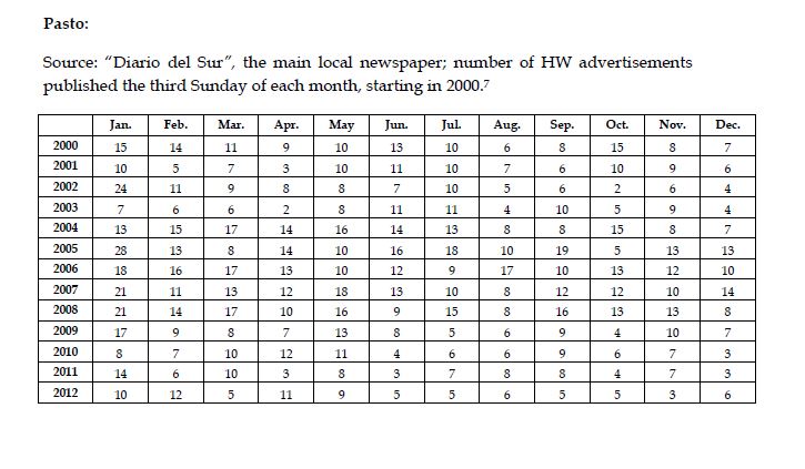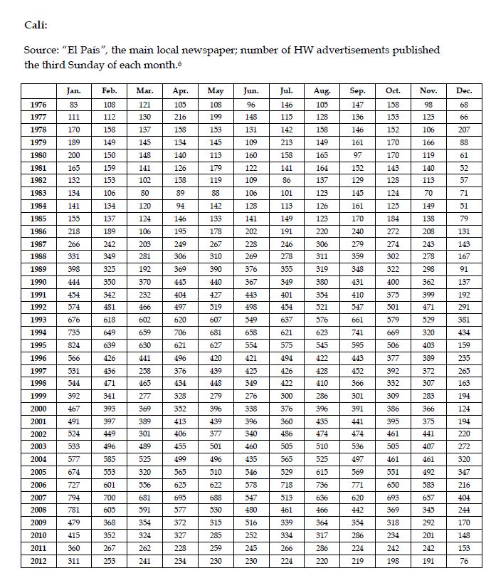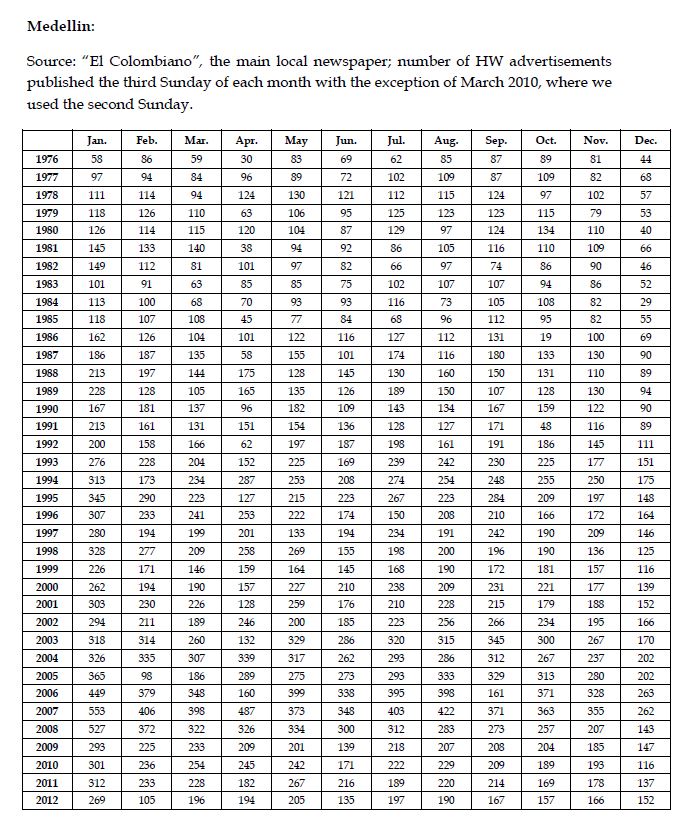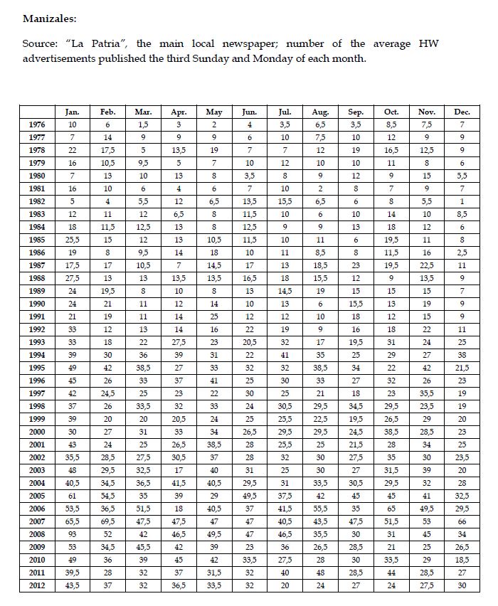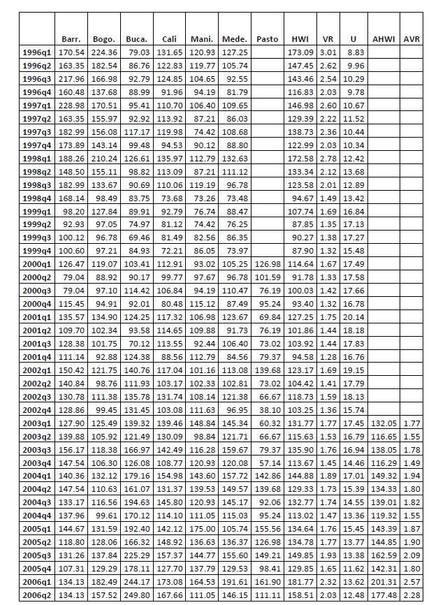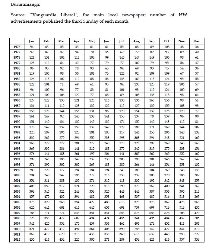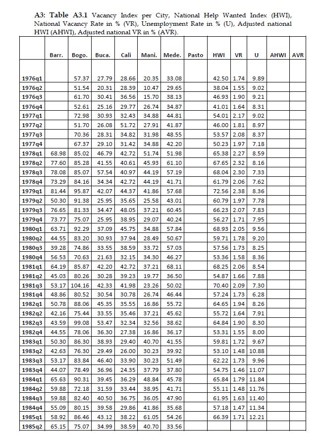 A partir del conteo de avisos clasificados de empleo en los principales periódicos se construye un índice de vacantes y una tasa de vacantes para Colombia. Este es el primer intento de construir series con representatividad nacional y de tal extensión no