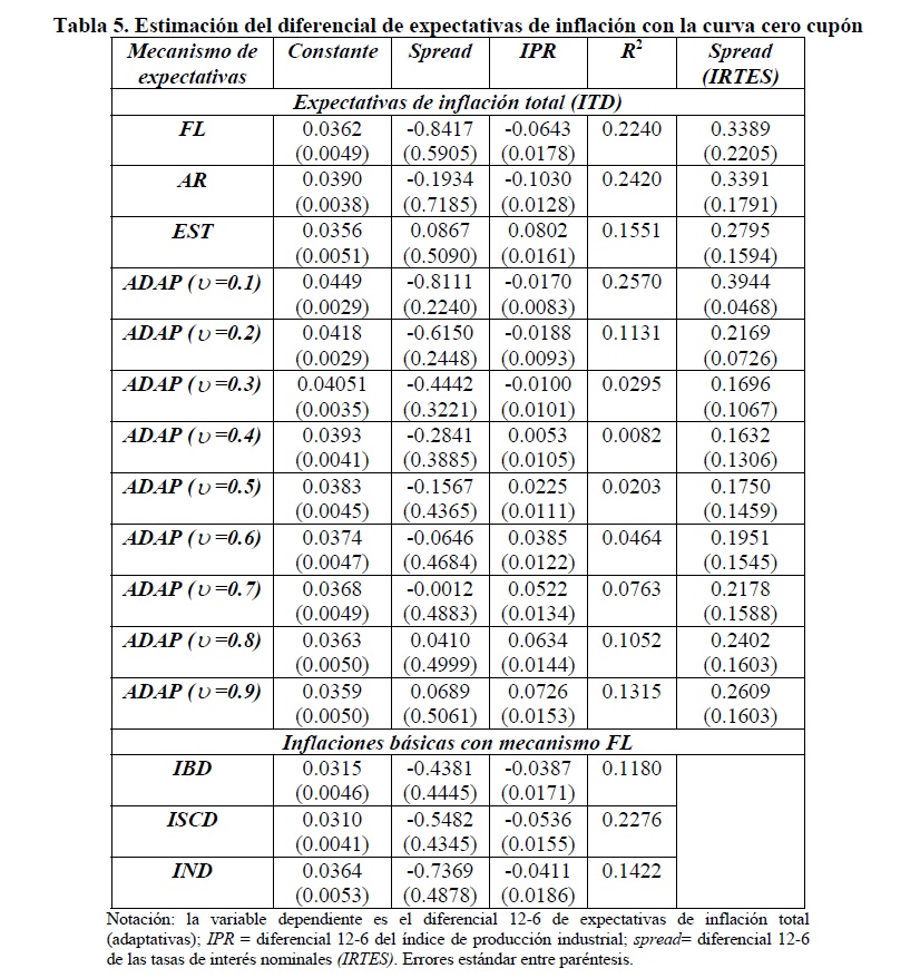 La consideración de la prima de riesgo de inflación en la ecuación de Fisher y los cambios de Régimen inflacionario en Colombia durante los últimos años nos permiten examinar la hipótesis de linealidad para los diferenciales esperados de inflación entre 6 y 12 meses adelante construidos suponiendo cuatro mecanismos de formación de expectativas sobre la inflación total futura: expectativas racionales, autorregresivas, estáticas y adaptativas. El primero de ellos se utiliza también para tres definiciones de inflación básica corrientemente empleadas por el Banco de la República. Se emplean dos conjuntos de información para examinar la hipótesis de la existencia del efecto Fisher: el IRTES y la curva cero cupón. Solamente para la inflación total y dos definiciones de inflación básica se pudo rechazar la hipótesis de linealidad. Siempre que se usa la IRTES los resultados son los que predice la teoría en signo y significancia. El contenido informativo del spread de tasas de interés es sensible al conjunto de información utilizado para construir y al mecanismo de expectativas empleado.