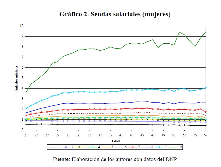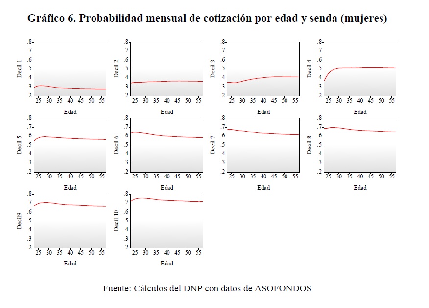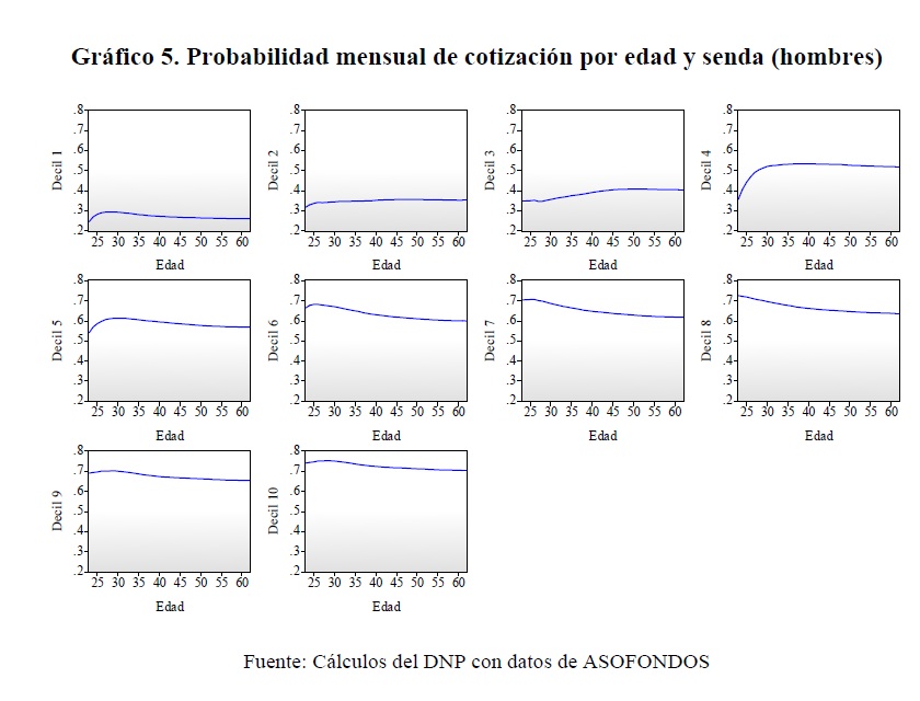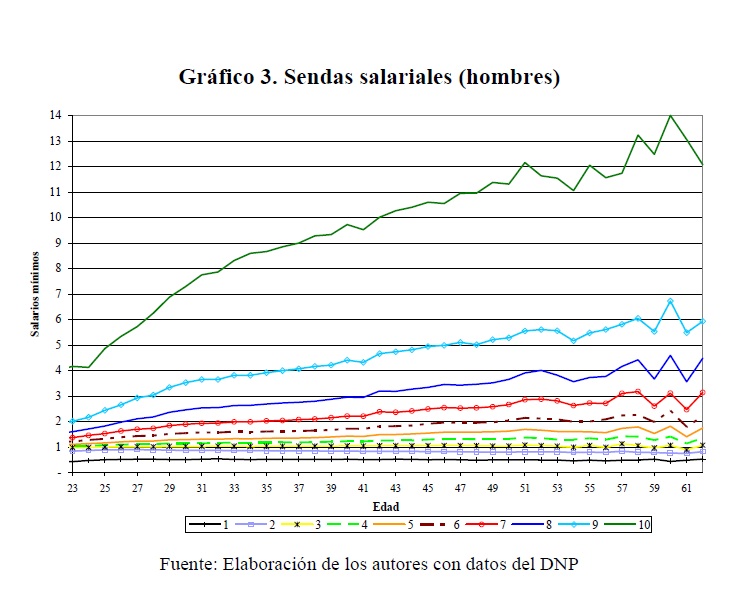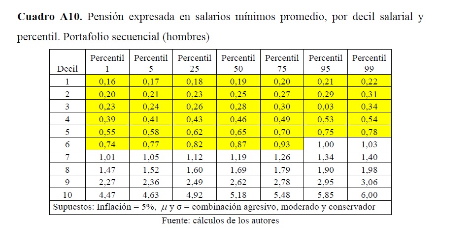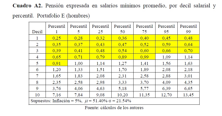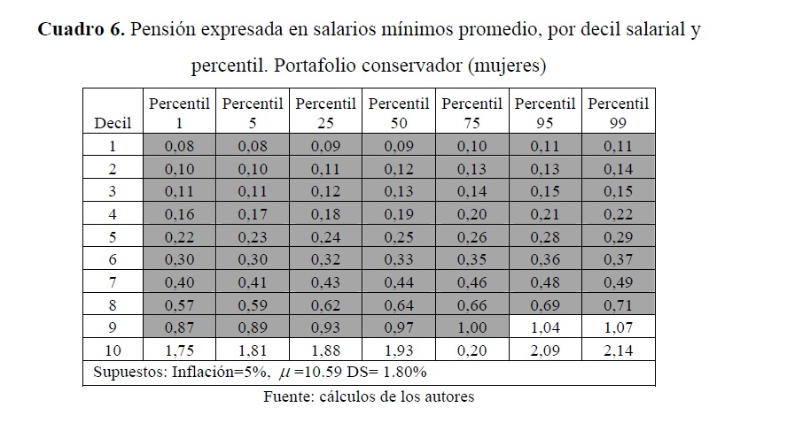 Este trabajo desarrolla un modelo de simulación para estimar el flujo de caja de un pensionado que tiene su cuenta individual en una administradora de fondos de pensiones (AFP) colombiana. Aquel se proyecta a partir de las sendas salariales y densidades de cotización estimadas por la Dirección de Estudios Económicos del Departamento Nacional de Planeación (DNP) y, con base en lo anterior, se calcula el valor de la pensión que se podría obtener a partir de la riqueza acumulada al final de la vida laboral. Los resultados muestran que, de no adoptar medidas encaminadas a aumentar las densidades y las tasas de cotización, un gran porcentaje de la fuerza laboral obtendría pensiones inferiores a la mínima establecida por ley, pero no cumpliría con los requisitos para acceder a la garantía estatal para obtener la misma.