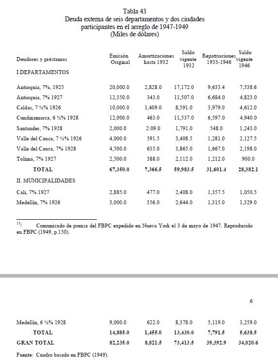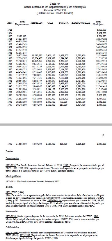 A diferencia de la segunda ronda de renegociación de la deuda externa (1938-1942), la tercera (1944-1949) se caracterizó por ser un período de rápidos acuerdos, más que uno de controversia en torno a las posiciones negociadoras. Estos convenios fueron los últimos en una serie de etapas cumplidas hasta la restauración completa del servicio de la deuda externa colombiana, el cual se había interrumpido formalmente desde principios de los años treinta. En términos cuantitativos, los departamentos y municipios, exceptuando Barranquilla, cuya deuda se había renegociado en 1939, llegaron a representar el 51% de la deuda en dólares representada en bonos, y el 46% de la deuda externa total de largo plazo del país, cuando empezaron las negociaciones a fines de los treinta. En este ensayo se describen la negociación final del Municipio de Bogotá y, posteriormente, el arreglo de la deuda de los departamentos y municipios que, para fines de los cuarenta, se encontraban todavía en moratoria.