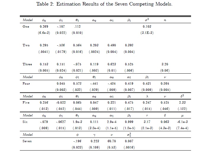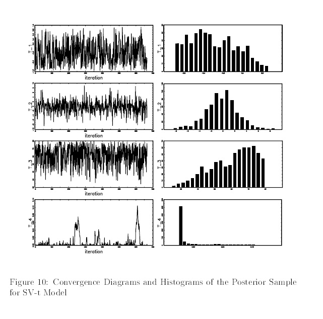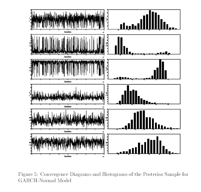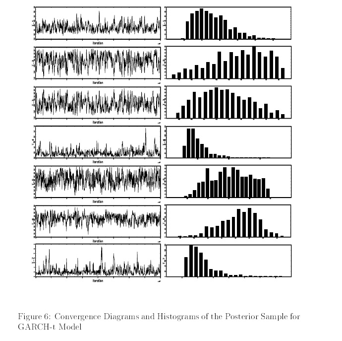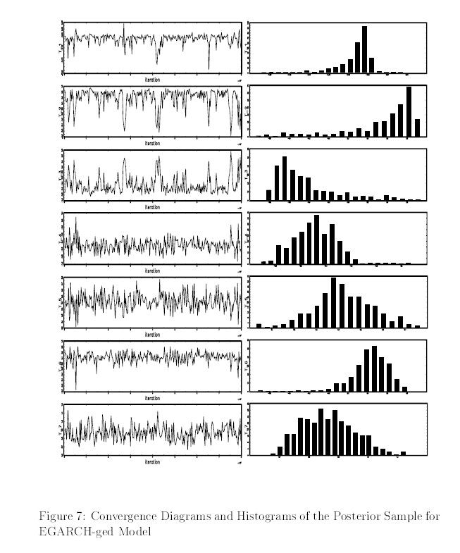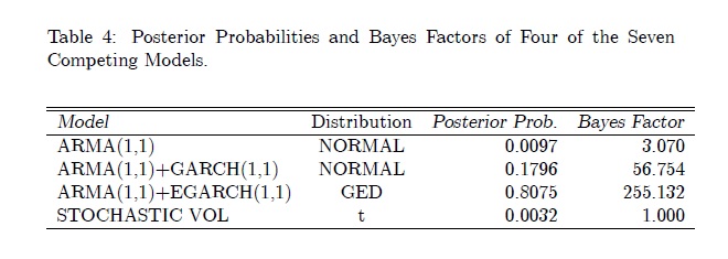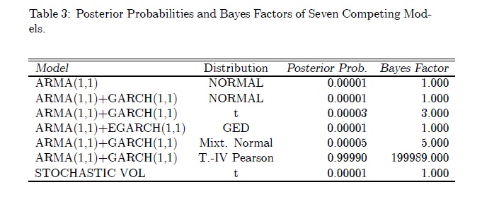 This document reviews and applies recently developed techniques for Bayesian estimation and model selection in the context of Time Series modeling for Stochastic Volatility. After the literature review on Generalized Conditional Autoregressive models, St