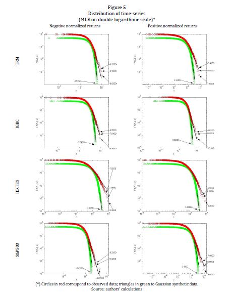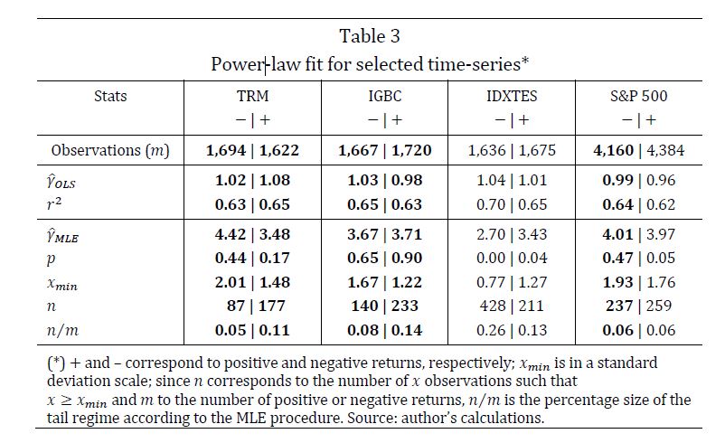 A maximum likelihood method for estimating the power-law exponent verifies that the positive and negative tails of the Colombian stock market index (IGBC) and the Colombian peso exchange rate (TRM) approximate a scale-free distribution, whereas none of th