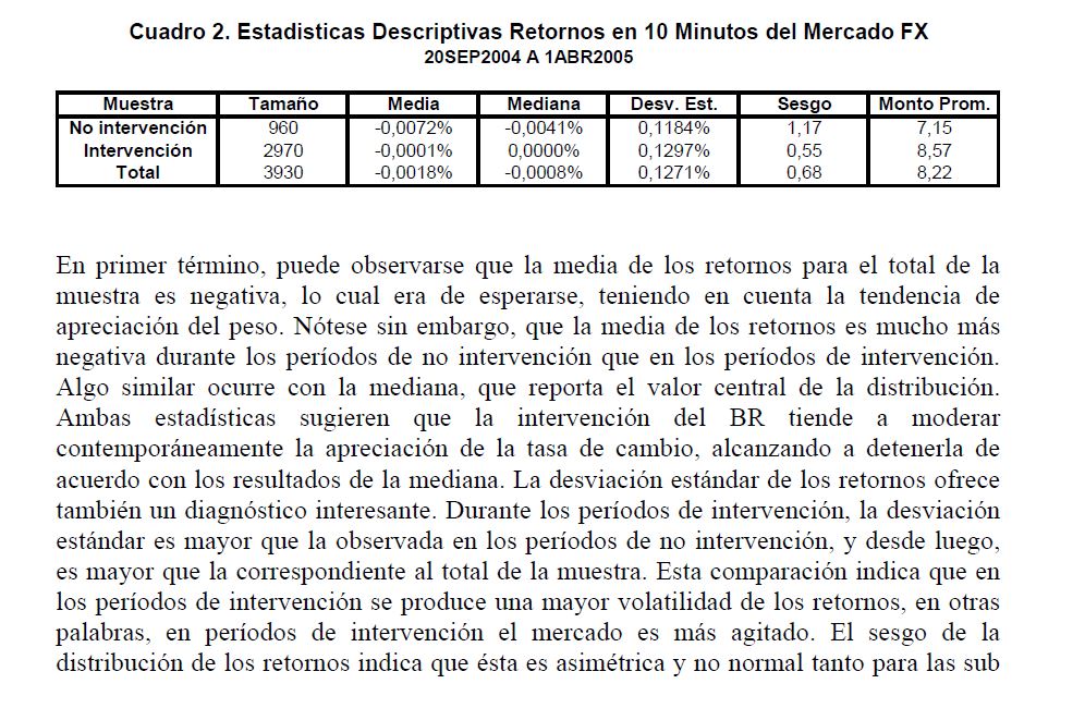 En este trabajo se hace una evaluación de la efectividad de la intervención discrecional utilizando una base de datos única que contiene información de alta frecuencia sobre el comportamiento intradía de la tasa de cambio, y de la intervención del Banco de la República. Se estima un modelo ARCH para los retornos (variaciones) de la tasa de cambio en intervalos de diez minutos. Se encuentra que la intervención obtiene el efecto deseado (un incremento permanente en la tasa de devaluación) sólo si se emite una señal creíble y no ambigua, acompañada de montos de intervención significativos. Adicionalmente, se obtiene que el diferencial entre la tasa de interés interna y externa es un determinante fundamental del retorno promedio. El conflicto entre el esquema de inflación objetivo y la intervención cambiaria ha debilitado la credibilidad de los agentes sobre la efectividad de la intervención, lo que se ha reflejado en un incremento de la volatilidad de los retornos. Los resultados econométricos son consistentes con la transmisión de los efectos a través del canal de Microestructura, y de la debilidad del canal de señales.