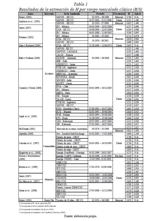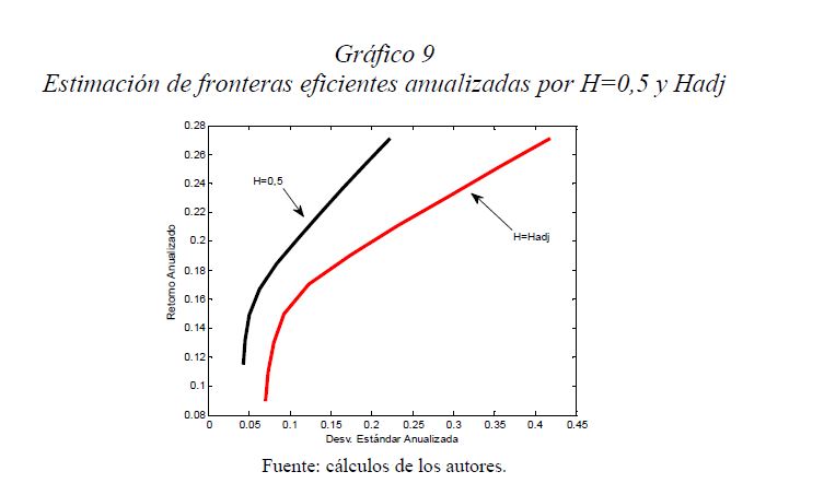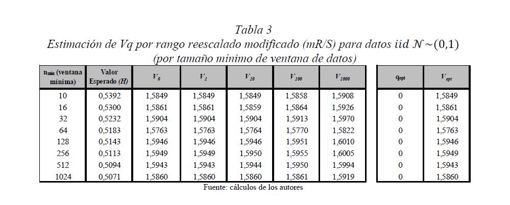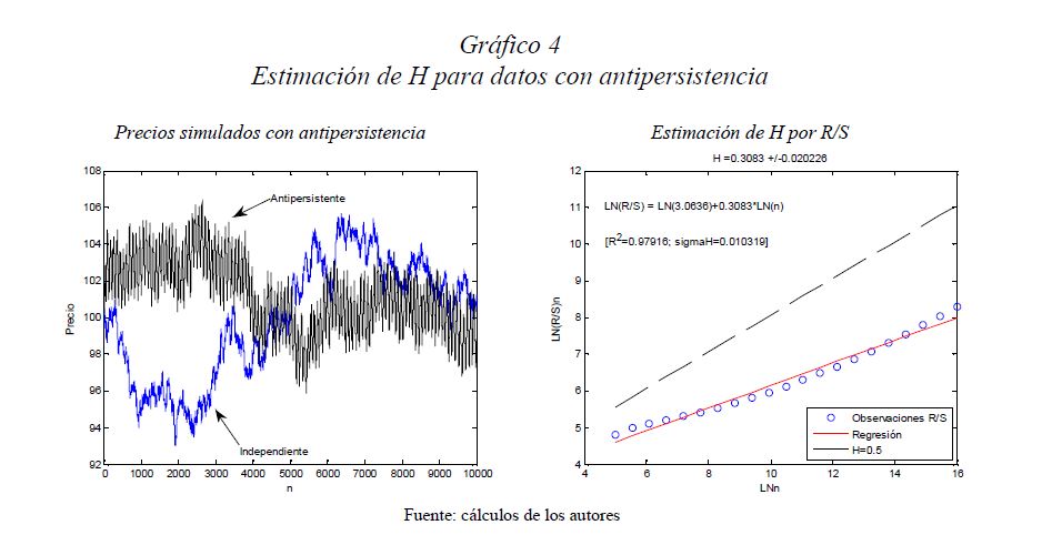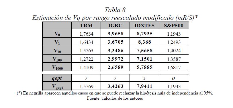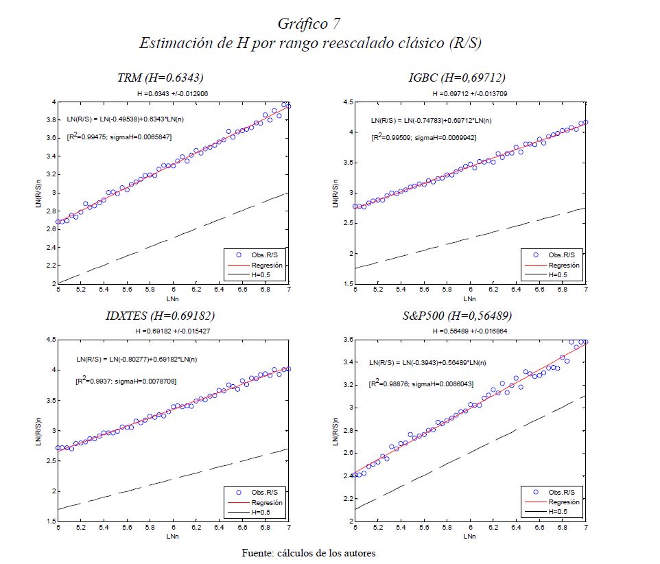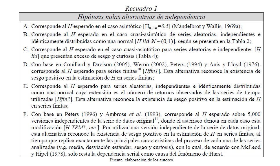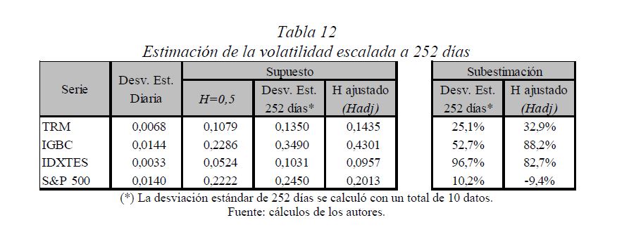 Es una práctica muy difundida el multiplicar la desviación estándar por la raíz del tiempo para escalarla a otros plazos. Así, con base en la estimación de la desviación estándar o del VaR (Value at Risk) diario, es usual obtener la desviación estándar o el VaR para un periodo de diez días como el producto de la primera y la raíz de diez. Esta práctica, basada en la hipótesis de los mercados eficientes, supone que los cambios de los precios son independientes entre sí; es decir, que las series de tiempo no presentan memoria. El presente documento se ocupa de estimar la presencia de memoria de largo plazo en los mercados cambiario, accionario y de renta fija colombianos, para lo cual se utiliza la metodología de rango reescalado clásico (R/S) y modificado (mR/S).Además de encontrar persistencia significativa para el mercado accionario y de renta fija, se estima el exponente de Hurst ajustado, el cual sirve para cuantificar el error derivado de algunas prácticas basadas en el supuesto de independencia. De acuerdo con los resultados obtenidos para dichos mercados, (i) el supuesto según el cual los precios reflejan toda la información disponible es errado; (ii) algunas prácticas en la optimización de portafolios y la valoración de activos son cuestionables, y (iii) tal como se infiere de la revisión hecha en 2009 por el Comité de Basilea a los estándares cuantitativos para el cálculo del riesgo de mercado, la regla de la raíz del tiempo subestima significativamente el riesgo.