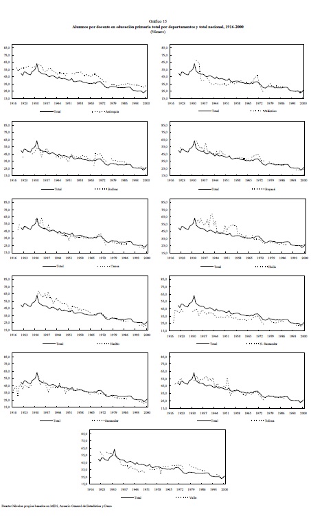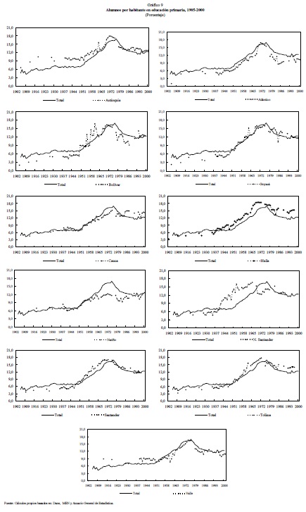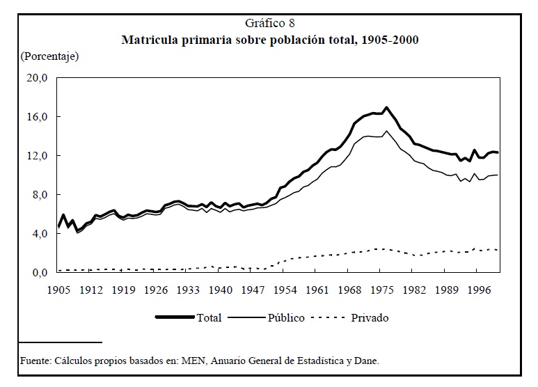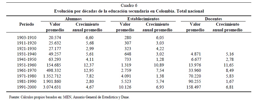 Este artículo analiza la evolución de la educación primaria y secundaria en Colombia durante el siglo XX desde una perspectiva de largo plazo. Se estudian las principales políticas educativas así como los cambios institucionales y organizacionales que ocurrieron. Se analiza la financiación de la educación, el comportamiento de las principales variables educativas y se examina la evolución de calidad de la educación en el país. Se encontró que la expansión de la educación, tanto primaria como secundaria a lo largo de la primera mitad el siglo XX fue muy lenta. Las transformaciones educativas sólo empezaron a ocurrir en la década de los cincuenta, cuando se presentó un rápido y sostenido crecimiento económico y un cambio significativo en la estructura económica y demográfica del país. Desde 1950 y hasta mediados de los setenta, los indicadores educativos crecieron a un ritmo nunca antes visto. Sin embargo, la expansión de los indicadores educativos se freno desde mediados de los setenta y hasta principios de los ochenta, cuando se dio una nueva expansión en los mismos que se mantuvo hasta finales de siglo. A pesar de estos grandes avances durante la segunda mitad del siglo XX, al finalizar los noventa el sector educativo Colombiano seguía presentando bajos niveles de cobertura, eficiencia y calidad así como vaguedad en las competencias y obligaciones en términos administrativos y financieros de los diferentes niveles gubernamentales.