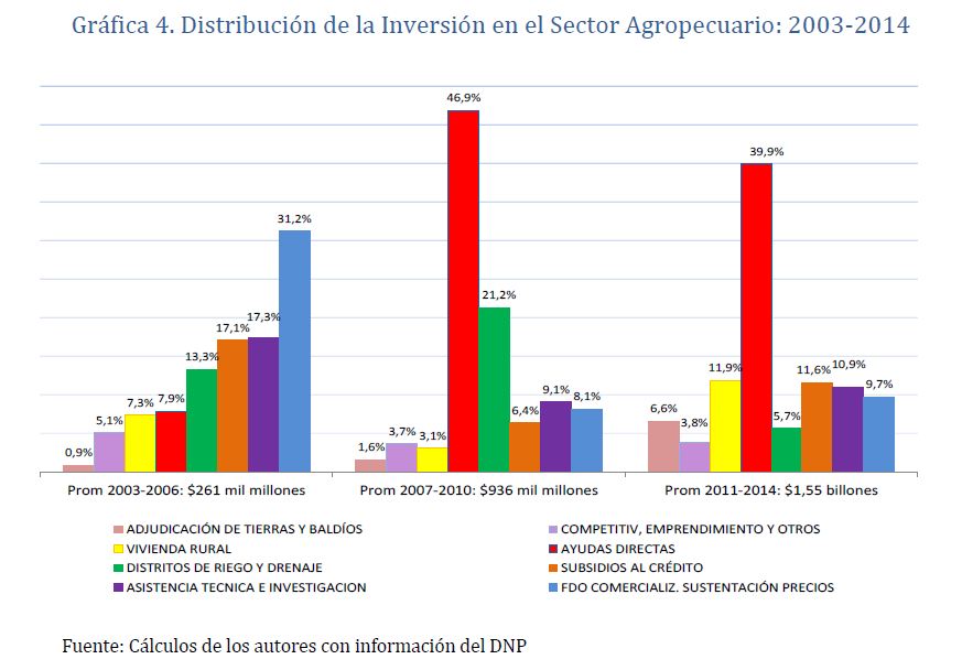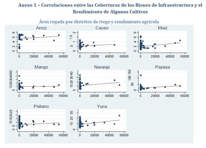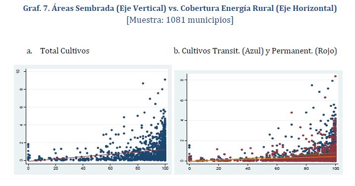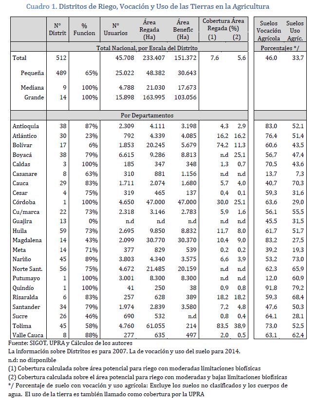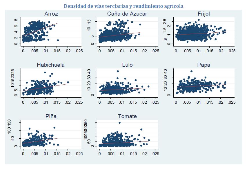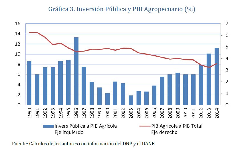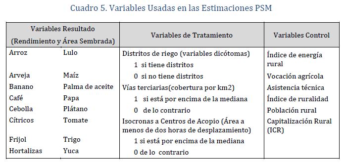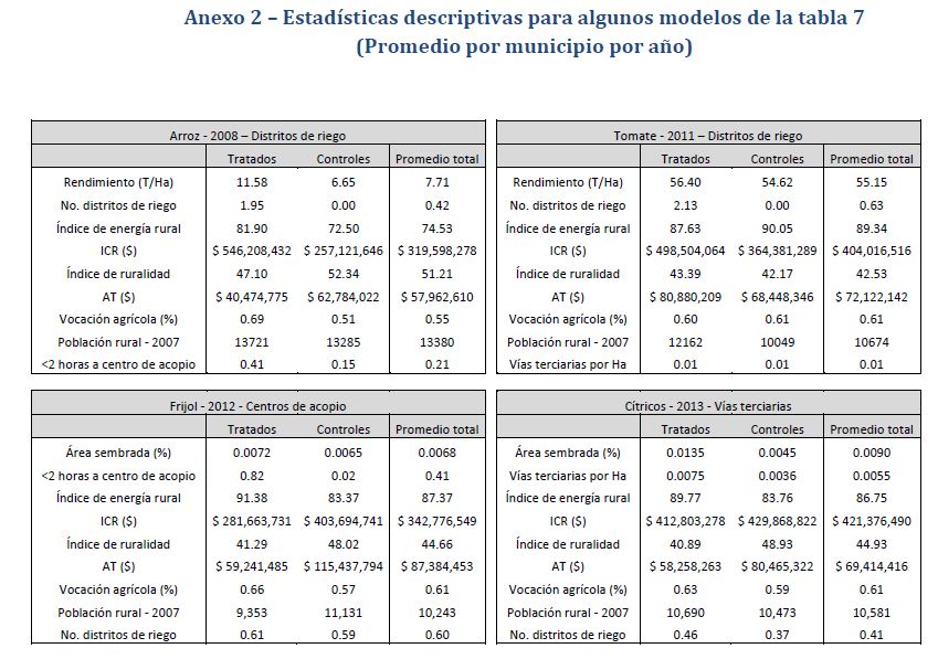 La agricultura ha sido históricamente una actividad prioritaria en Colombia. Su desempeño depende primordialmente de la productividad, la cual parece estar correlacionada con los bienes públicos del sector. En el trabajo se estiman las coberturas de los principales bienes de infraestructura y se evalúan sus efectos sobre el rendimiento y el área sembrada de dieciséis cultivos cosechados en diversas regiones del país. Utilizando modelos de emparejamiento (Propensity Score Matching) se encuentra que el rendimiento de una tercera parte de los cultivos ha sido impactado positivamente por los distritos de riego y drenaje. También revela que el mejor acceso a los centros de acopio y la red de vías terciarias afectan positivamente las áreas sembradas de la 05r parte de los cultivos. Una reasignación de los recursos del Estado hacia la provisión de infraestructura rural es crucial para el desarrollo agrícola del país.