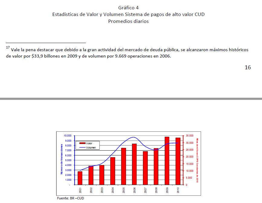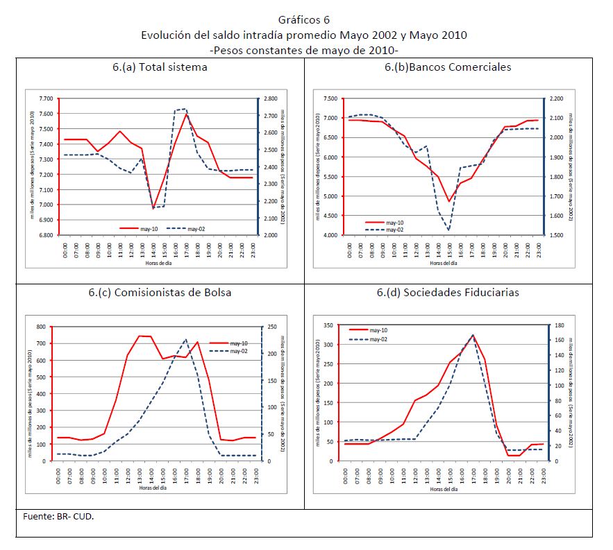 En el presente trabajo se realiza un análisis de estática comparativa relacionado con la cuantificación de la contribución de las distintas fuentes de liquidez que utilizan las entidades financieras en Colombia para cumplir (liquidar) sus obligaciones en el sistema de pagos de alto valor operado por el Banco de la República, al que se denomina sistema CUD. Con base en ello se evalúa también la incidencia de diversas políticas adoptadas por el banco central para propender por la liquidación más temprana de las operaciones y mitigar riesgos de liquidez en el sistema de pagos de alto valor. Para tales efectos, se consideró el comportamiento transaccional y de liquidez intradía de los participantes en el CUD correspondiente a dos periodos de marcadas diferencias tanto en la funcionalidad del sistema como en el entorno económico (05 de 2002 y 05 de 2010), agregando la información por grupos de agentes más activos como son los bancos, comisionistas de bolsa y sociedades fiduciarias.En la metodología propuesta se asume que los participantes utilizan como fuente primaria su saldo en cuentas de depósito en el banco central (encaje) con el cual inician un día de operaciones, luego se calcula el valor efectivo de la liquidez provista por el Banco de la República u obtenida en el mercado monetario y se toma como residuo la dinámica de los pagos entre los agentes (liquidez de los pagos entrantes). Este análisis permite hacer una aproximación preliminar a la identificación de las estrategias utilizadas por las entidades financieras respecto al uso de cada una de las fuentes alternativas de liquidez en el sistema de pagos y a identificar riesgos potenciales que se derivan de las mismas para cada tipo de participantes y sobre el sistema en su conjunto. También provee elementos de juicio a las autoridades financieras para el diseño de políticas macroprudenciales que mitiguen el riesgo de liquidez y el riesgo sistémico.