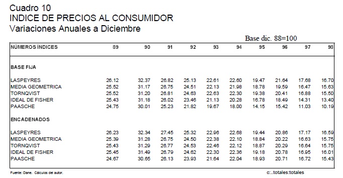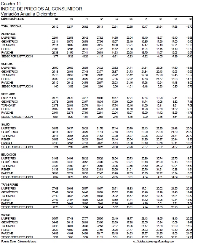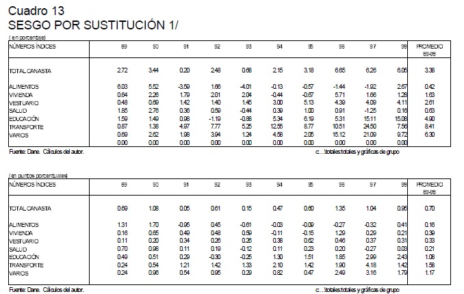Este trabajo reseña los diferentes sesgos presentes en la medición del IPC en Colombia y cuantifica la magnitud del sesgo por sustitución en el consumo. Para esto último, se computó el IPC con diferentes fórmulas de números índices (Laspeyres, Paasche, media geométrica, Ideal de Fisher y Tornqvist) y se analizó el nivel, la inflación y el sesgo por sustitución. Este último indicador se construyó identificando la diferencia, en porcentaje o en puntos porcentuales, de cualquier índice numérico con respecto a un índice que nos aproxima correctamente a un verdadero Indice de Costo de Vida, en este caso el índice Tornqvist encadenado. Los resultados obtenidos verifican que el índice utilizado por el DANE (Laspeyres) sobrestimó sistemáticamente la inflación al consumidor en 0.7 puntos porcentuales por año en el período 1989-1998, con un rango de sobrestimación que va de 0.2 puntos porcentuales en 1991 a 1.0 puntos en 1997. Adicionalmente, el documento presenta una evaluación de la nueva metodología del IPC del DANE (IPC-98), con el objetivo de identificar las diferentes innovaciones metodológicas incorporadas en la nueva canasta, las cuales permiten corregir o reducir los diferentes sesgos en el cálculo del IPC en Colombia.