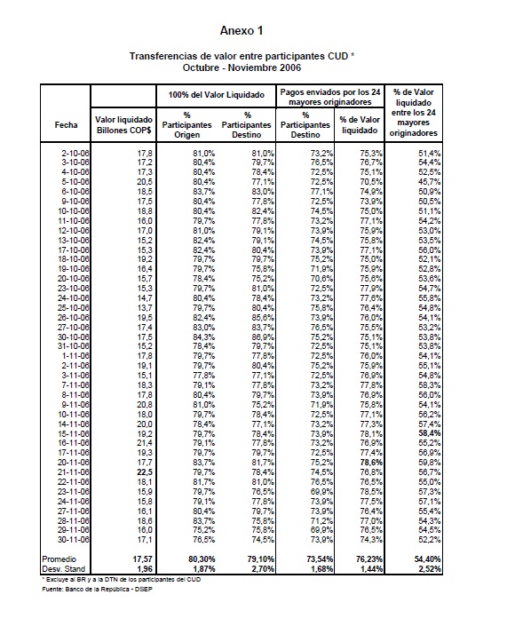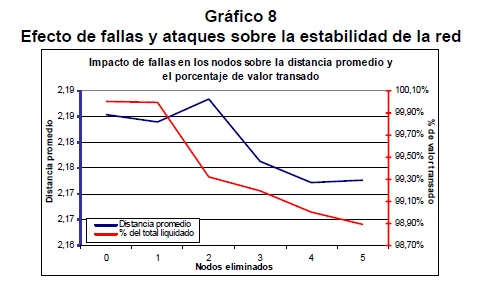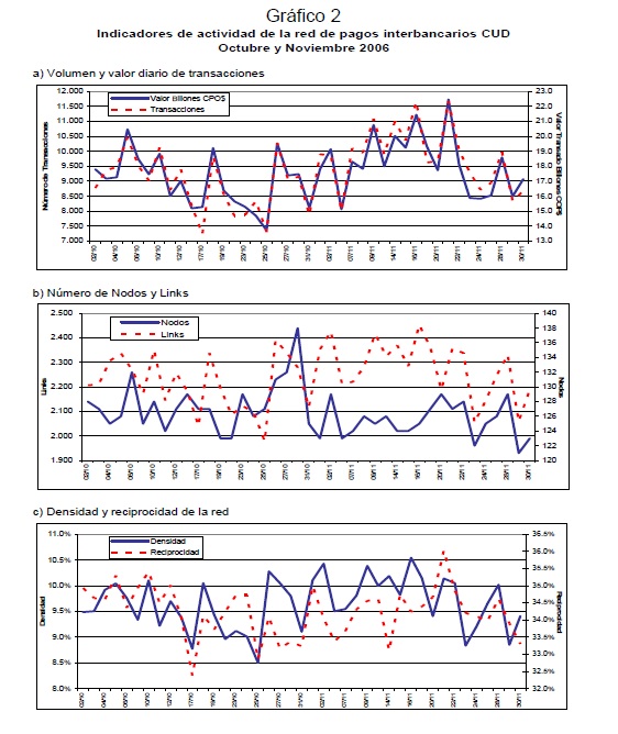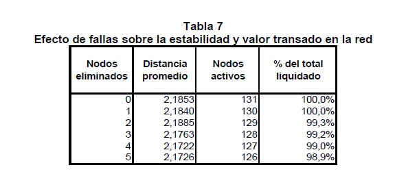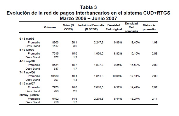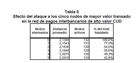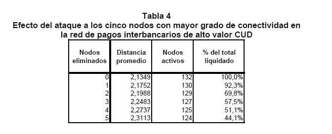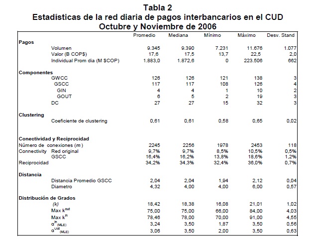 Las transferencias de fondos que se realizan entre los participantes en un sistema de pagos conforman redes de valor que, por su naturaleza, están expuestas a riesgos financieros de diverso género y, en particular, al potencial de riesgo sistémico. La incidencia que ello tendría sobre la estabilidad financiera, la transmisión de la política monetaria y la actividad económica son algunas de las razones que explican el interés de los Bancos Centrales por promover los objetivos de seguridad y eficiencia en los sistemas de pago. Los aportes de la física estadística en el análisis de redes complejas han permitido reconocer la estrecha relación existente entre la estructura, el funcionamiento de la red y su estabilidad. Soportado en esta rama de la física, este documento constituye una primera aplicación de la topología de redes al análisis de la red de valor que se conforma entre los participantes del Sistema de Pagos de Alto Valor CUD de Colombia. La identificación de la topología y de las propiedades de ésta red, junto con la cuantificación del impacto de algunos choques simulados sobre la estabilidad y el valor liquidado en la red, son los objetivos principales que persigue esta investigación. Se concluye que las eventuales perturbaciones simuladas tienen un efecto significativo sobre el flujo normal de los pagos, tanto por el resquebrajamiento de la infraestructura de pagos como por los problemas de coordinación que se derivan entre sus participantes. Con base en tales resultados es posible sugerir una serie de políticas encaminadas a garantizar el flujo normal de los pagos, ya sea mediante acciones preventivas que reduzcan la probabilidad de ocurrencia de interrupciones en el sistema o correctivas que permitan, ante la eventual realización de estas interrupciones, la pronta recuperación de la estabilidad de la red de pagos.