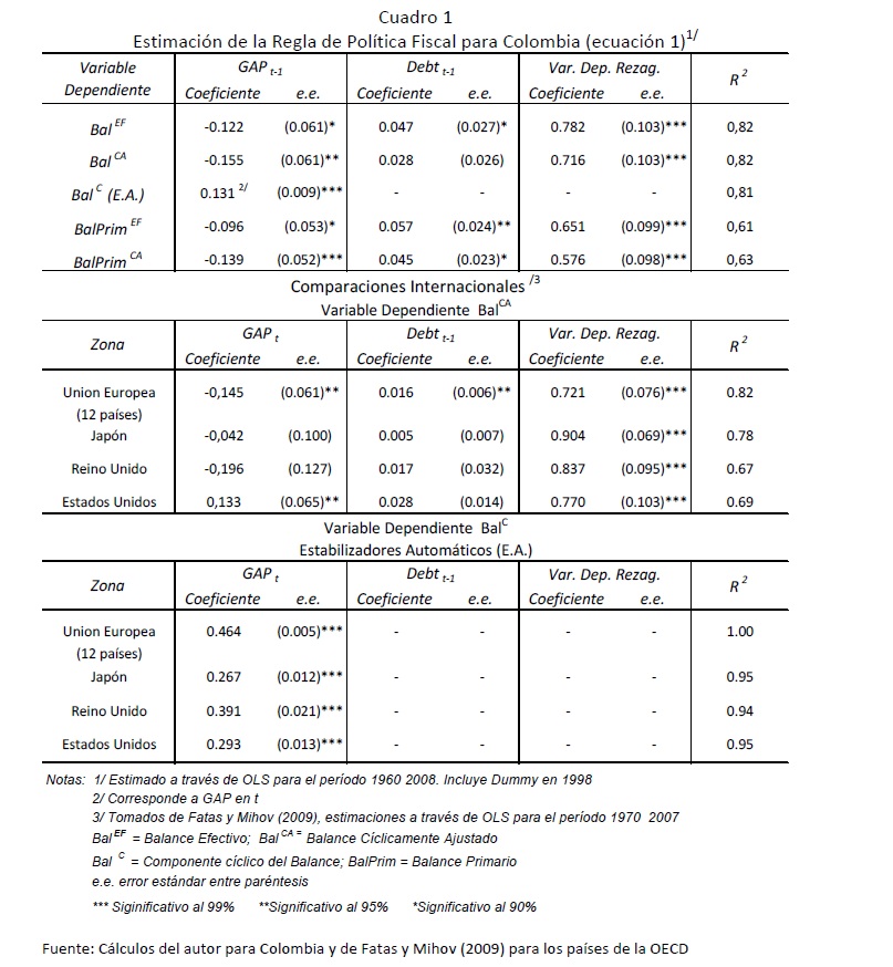 En este documento se caracteriza la política fiscal en Colombia a partir de la valoración de los tres aspectos más relevantes desde la perspectiva macroeconómica: su posición frente al ciclo, su volatilidad y la sostenibilidad de la deuda. Los resultados encontrados se comparan a nivel internacional. Adicionalmente se analiza la postura de la autoridad fiscal frente a la crisis internacional y se evalúan dos escenarios sobre sus posibles repercusiones. Utilizando una regla de política se encuentra que la política discrecional del gobierno ha sido procíclica en el mediano y largo plazo, que ha reducido su volatilidad en los últimos años y que ha sido consecuente con la condición de sostenibilidad. La evidencia indica que hasta ahora la autoridad fiscal no ha diseñado un programa contra-cíclico para compensar los efectos de la crisis y que espera que operen los estabilizadores automáticos en la recuperación para superar los desajustes que se presenten en la actual coyuntura. En el corto y mediano plazo las finanzas del gobierno nacional sufrirán un apreciable deterioro, por la caída en la actividad económica: sus ingresos se podrían contraer, en términos reales, entre -3% y -4,5% en 2010, el balance primario será negativo hasta 2011 (oscilará entre -0,8% y -1,5% del PIB) y la deuda alcanzaría niveles cercanos a los registrados a comienzos de la década.