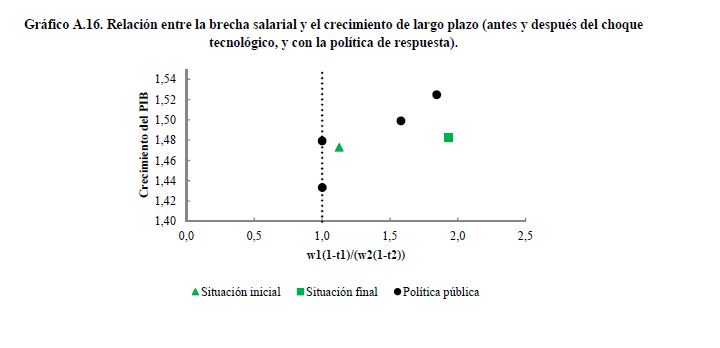 Durante las últimas décadas el incremento en la desigualdad experimentado por algunas economías desarrolladas ha estado relacionado con la adopción de tecnologías que utilizan intensivamente la mano de obra calificada. En este documento se plantea un modelo teórico en el que se recoge parte de la evidencia empírica sobre los efectos del cambio tecnológico sesgado sobre el crecimiento y la desigualdad. De igual forma, se analiza la efectividad de la política pública para suavizar los efectos negativos del cambio tecnológico sobre la brecha salarial y aprovechar sus bondades, en términos de crecimiento. Los resultados del modelo evidencian que ante un choque tecnológico, una política fiscal eficiente permite alcanzar un equilibrio de largo plazo con 05r expansión del PIB y menor brecha salarial que en la situación inicial.