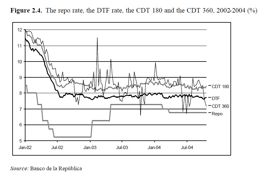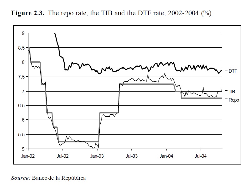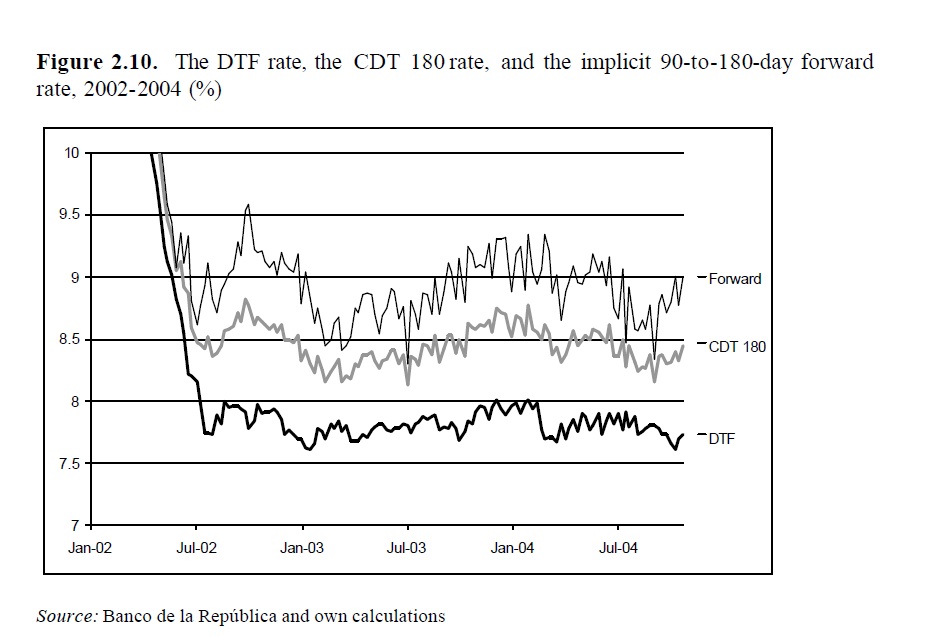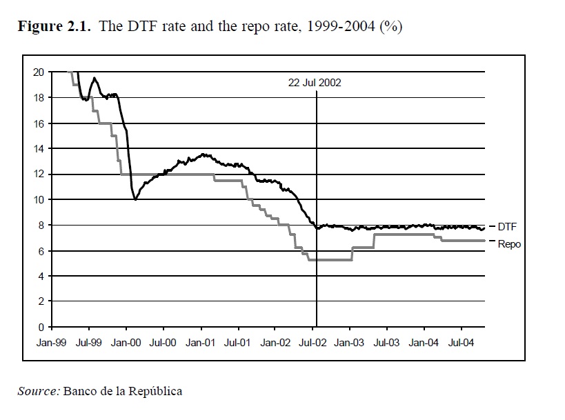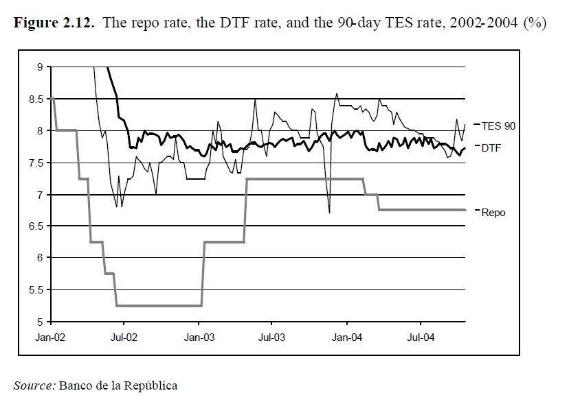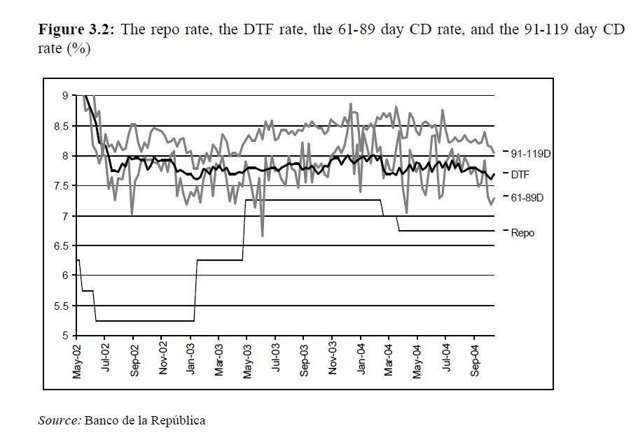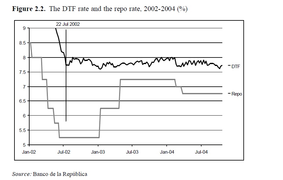 The 90-day DTF rate is the main benchmark interest rate in Colombia. Since mid-July 2002 this rate has remained more or less constant at around 7.8 percent. More importantly, it did not react to any of two 100-basis-point increases in the overnight repo