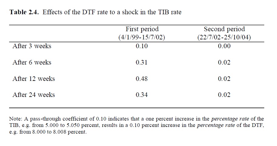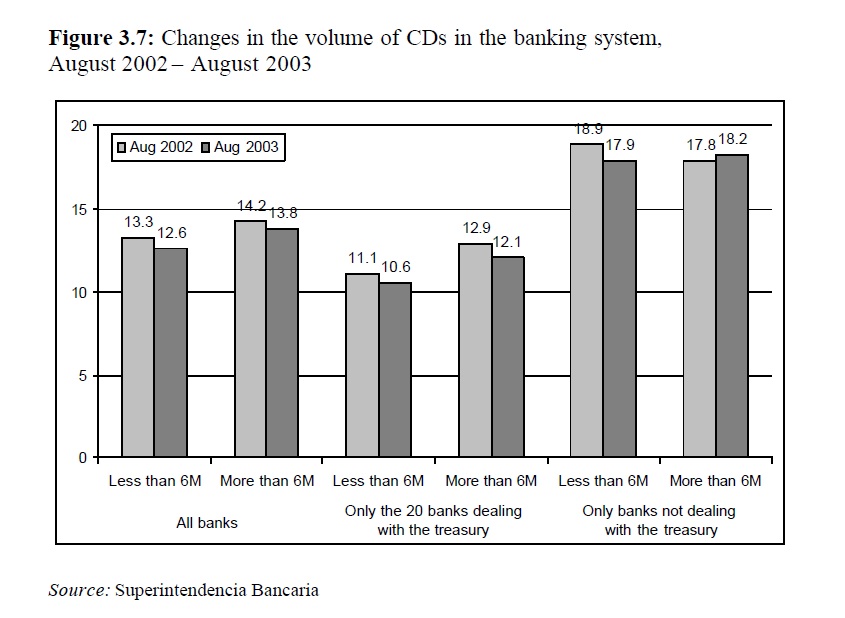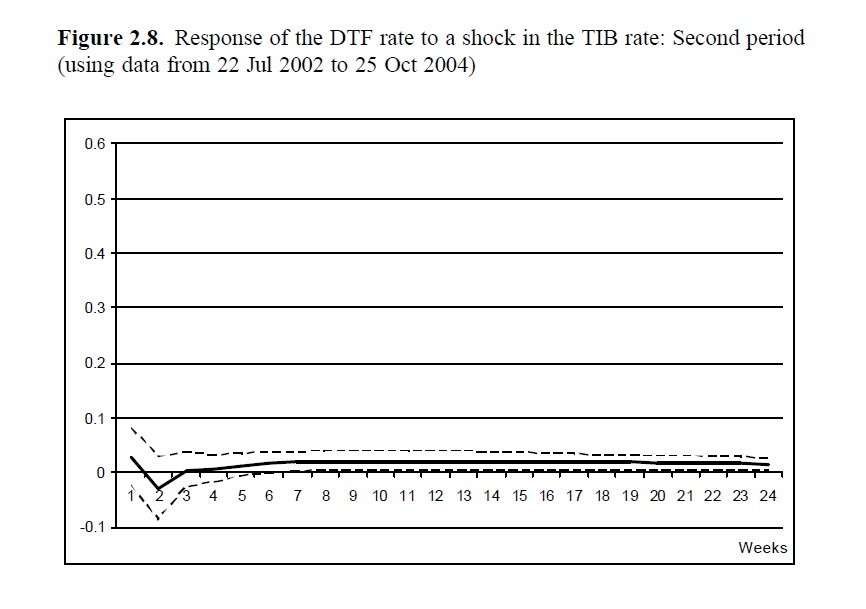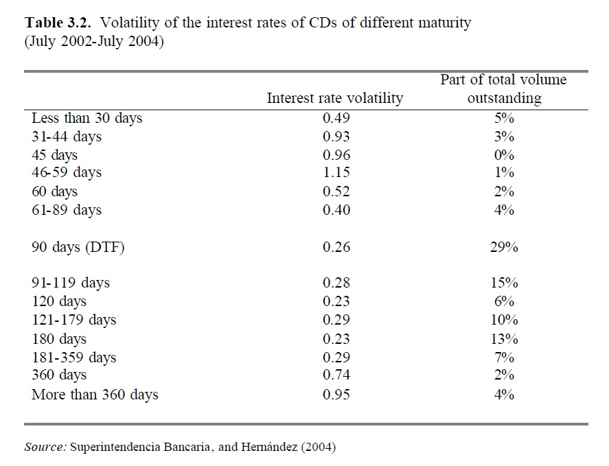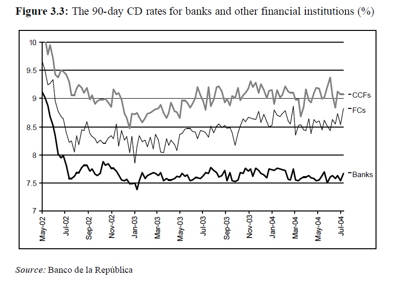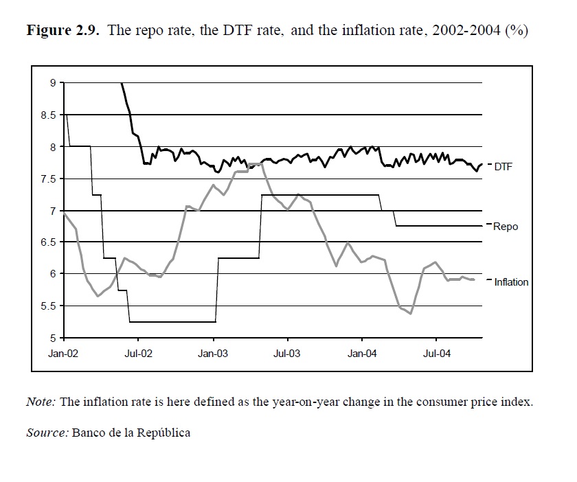 The 90-day DTF rate is the main benchmark interest rate in Colombia. Since mid-July 2002 this rate has remained more or less constant at around 7.8 percent. More importantly, it did not react to any of two 100-basis-point increases in the overnight repo