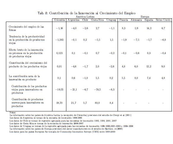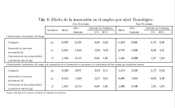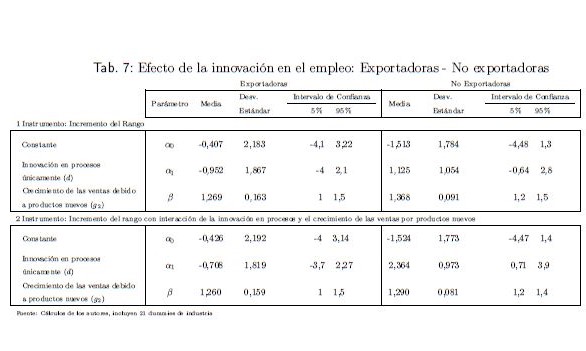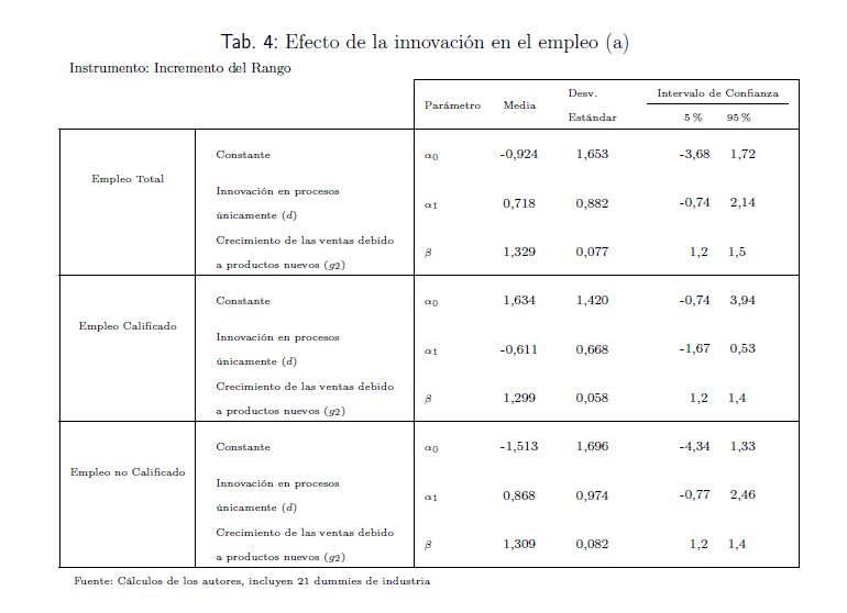 La innovación tecnológica es reconocida como uno de los factores determinantes del crecimiento económico. La innovación en variedades, en calidad y la disminución de costos resultante de la misma son variables que explican el crecimiento económico de acuerdo con modelos seminales como los de Grossman y Helpman (1993). Una pregunta relacionada pero que a nivel teórico parece no tener una respuesta concluyente, es cuál es el impacto de la innovación tecnológica sobre el empleo. El objetivo de este estudio es doble. En primer lugar se presenta evidencia empírica del efecto neto de la innovación sobre el empleo a nivel de firma en Colombia utilizando un modelo teórico simple pero estructural. En segundo lugar, dado que la metodología econométrica requiere el uso de variables instrumentales, se propone un estudio donde se tenga en cuenta la incertidumbre en la relación entre las variables instrumentales y el error aleatorio. Esto se hace implementando técnicas bayesianas. Nuestros resultados muestran que, en línea con los resultados encontrados para otros países, la innovación en productos es una fuente importante de generación de empleo y explica parte del crecimiento del empleo en Colombia, mientras que, a diferencia de otros países de Latino américa y Europa, no hay evidencia que la innovación en procesos tienda a desplazar el empleo.