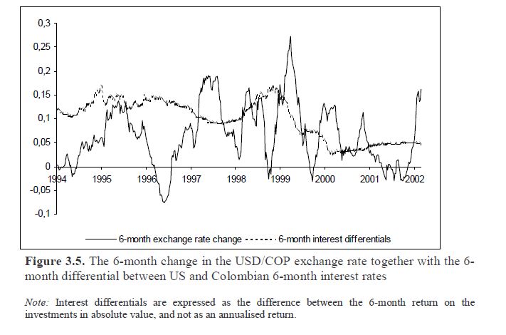 This paper tests the uncovered interest parity (UIP) hypothesis for the USD/COP exchange rate, using weekly data for the period from January 1994, when Colombia introduced its crawling band exchange rate regime, to August 2002. The study yields several in